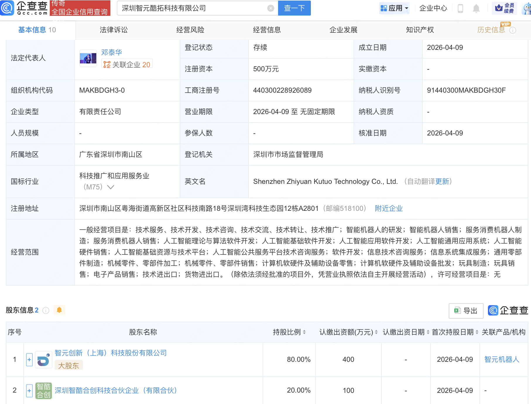 企查查APP显示,近日,深圳智元酷拓科技有限公司成立,经营范围包含:智能机器人的研发;智能机器人销售;人工智能理论与算法软件开发;人工智能基础软件开发等。企查查股权穿透显示,该公司由智元机器人关联公司智元创新(上海)科技股份有限公司等共同持股。