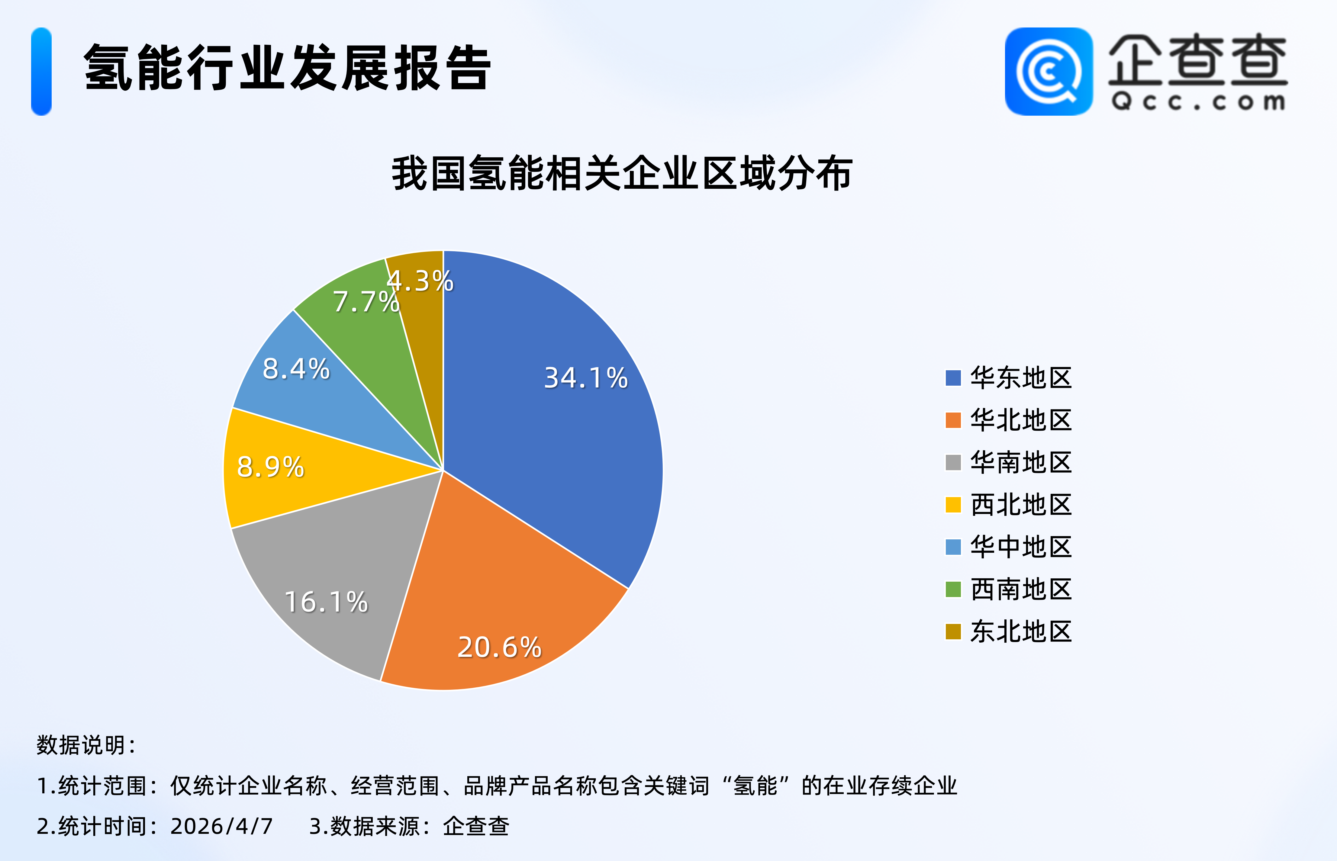 企查查数据显示,我国现存的3920家氢能相关企业中,区域分布上,位于华东地区的相关企业最多,占比34.1%,其次是华北地区,占比20.6%,西南、东北地区相对较少,分占7.7%、4.3%。