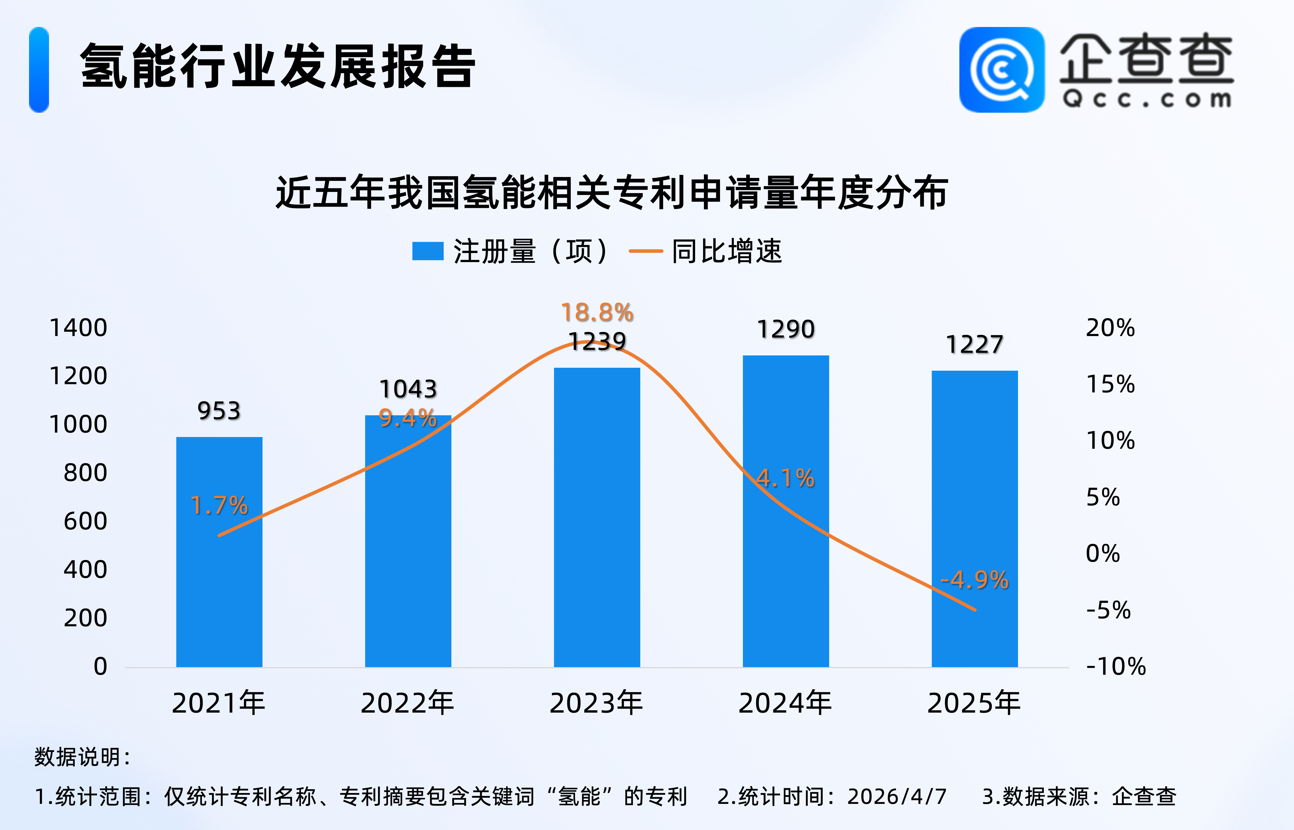 企查查数据显示,我国现有8328项氢能相关专利。2021年以来,我国累计申请5793项氢能相关专利,其中2023年申请量同比增加18.8%至1239项,成为近五年氢能相关专利申请量增速最大的一年。2025年全年氢能相关专利申请量达1227项。