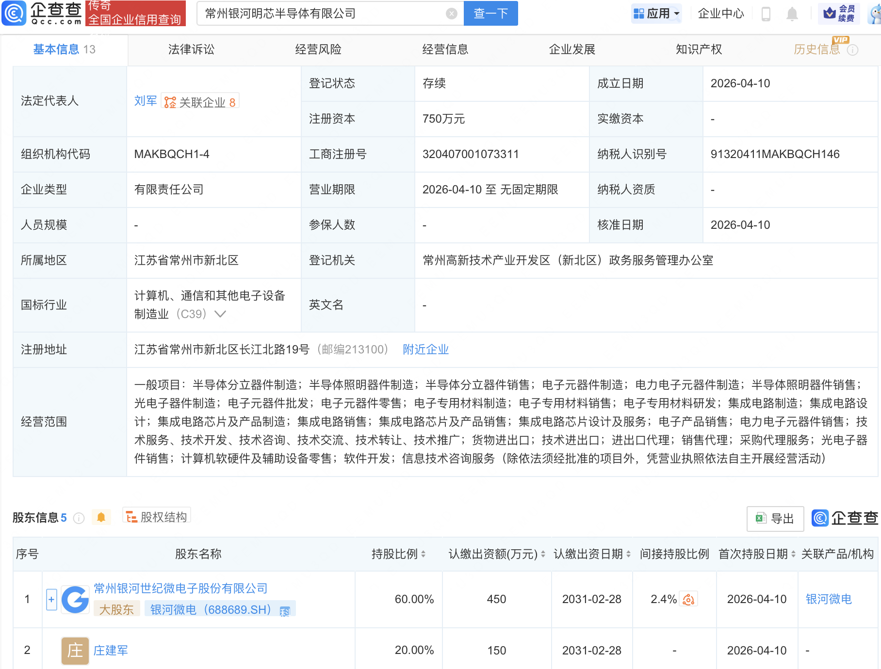 企查查APP显示,近日,常州银河明芯半导体有限公司成立,经营范围包含:半导体分立器件制造;半导体照明器件制造;集成电路芯片及产品销售;集成电路芯片设计及服务等。企查查股权穿透显示,该公司由银河微电(688689)等共同持股。