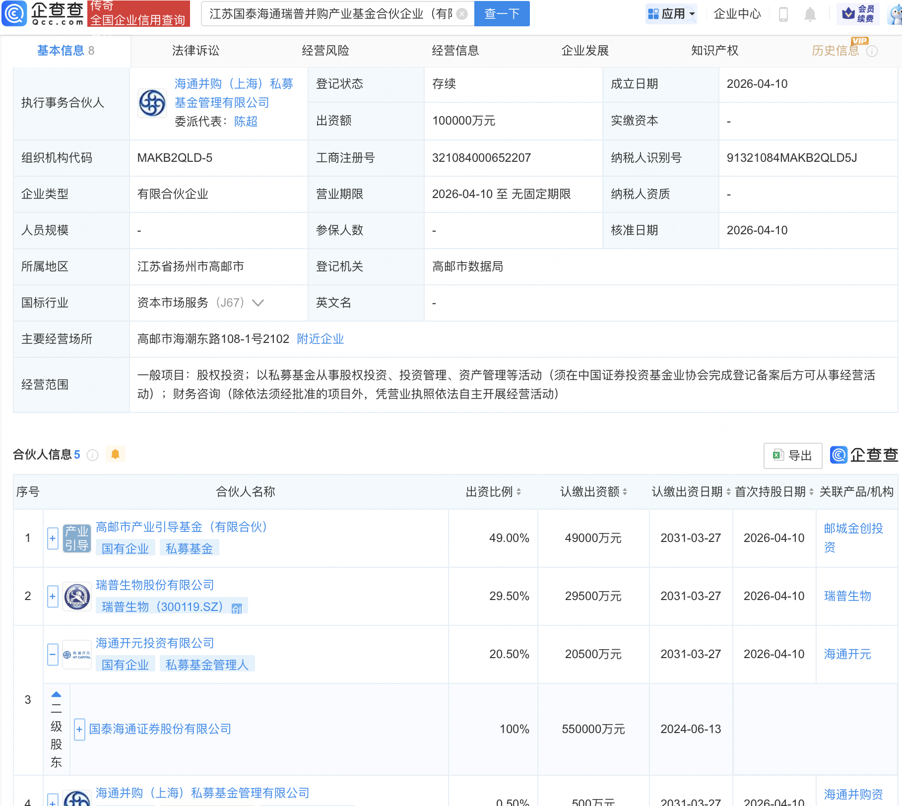 企查查APP显示,近日,江苏国泰海通瑞普并购产业基金合伙企业(有限合伙)成立,出资额10亿元,经营范围包含:股权投资;以私募基金从事股权投资、投资管理、资产管理等活动。企查查股权穿透显示,该企业由瑞普生物(300119)、国泰海通(601211)全资子公司海通开元投资有限公司等共同出资。
