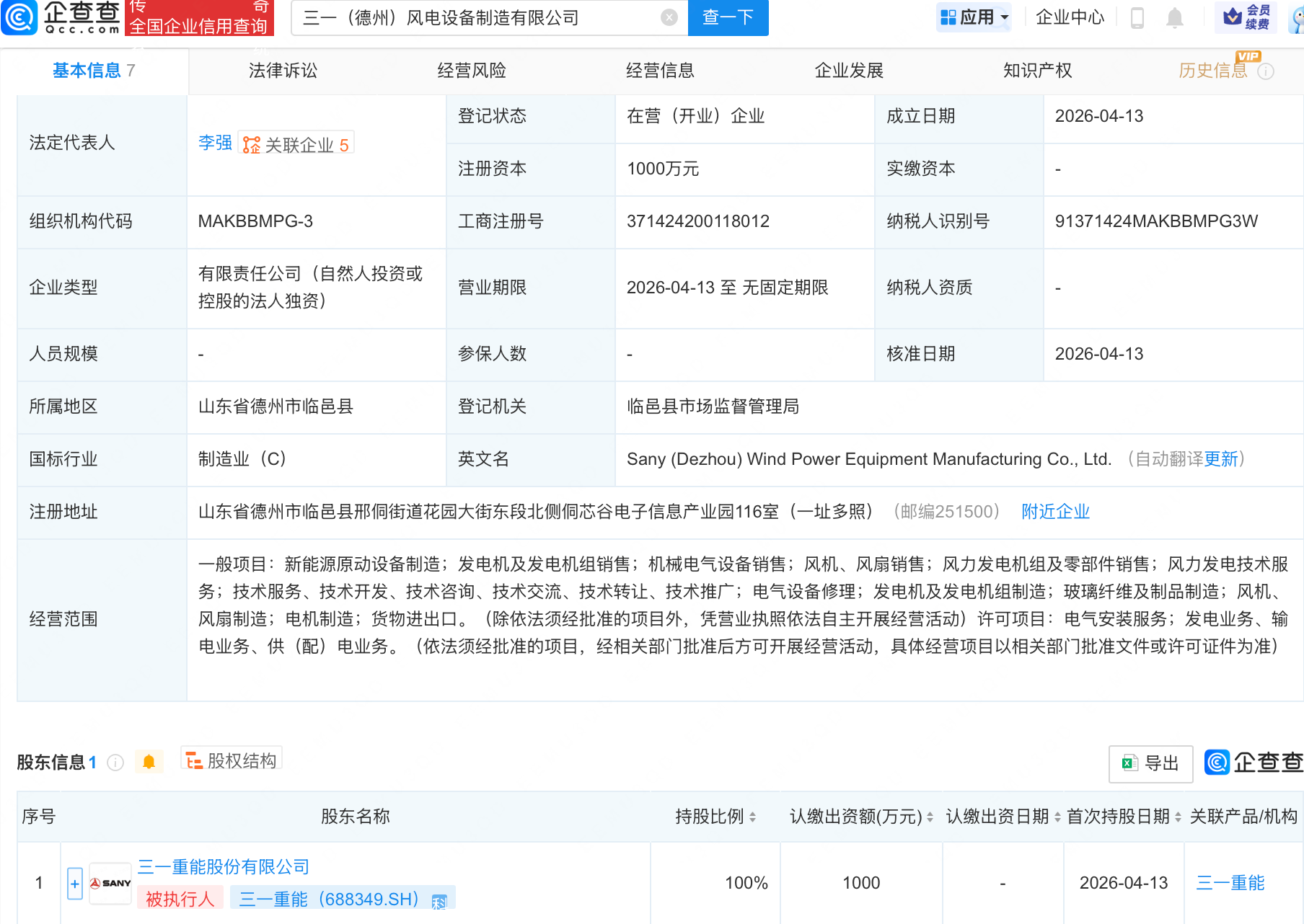 企查查APP显示,近日,三一(德州)风电设备制造有限公司成立,注册资本1000万元,经营范围包含:机械电气设备销售;风机、风扇销售;风力发电机组及零部件销售;风力发电技术服务等。企查查股权穿透显示,该公司由三一重能(688349)全资持股。
