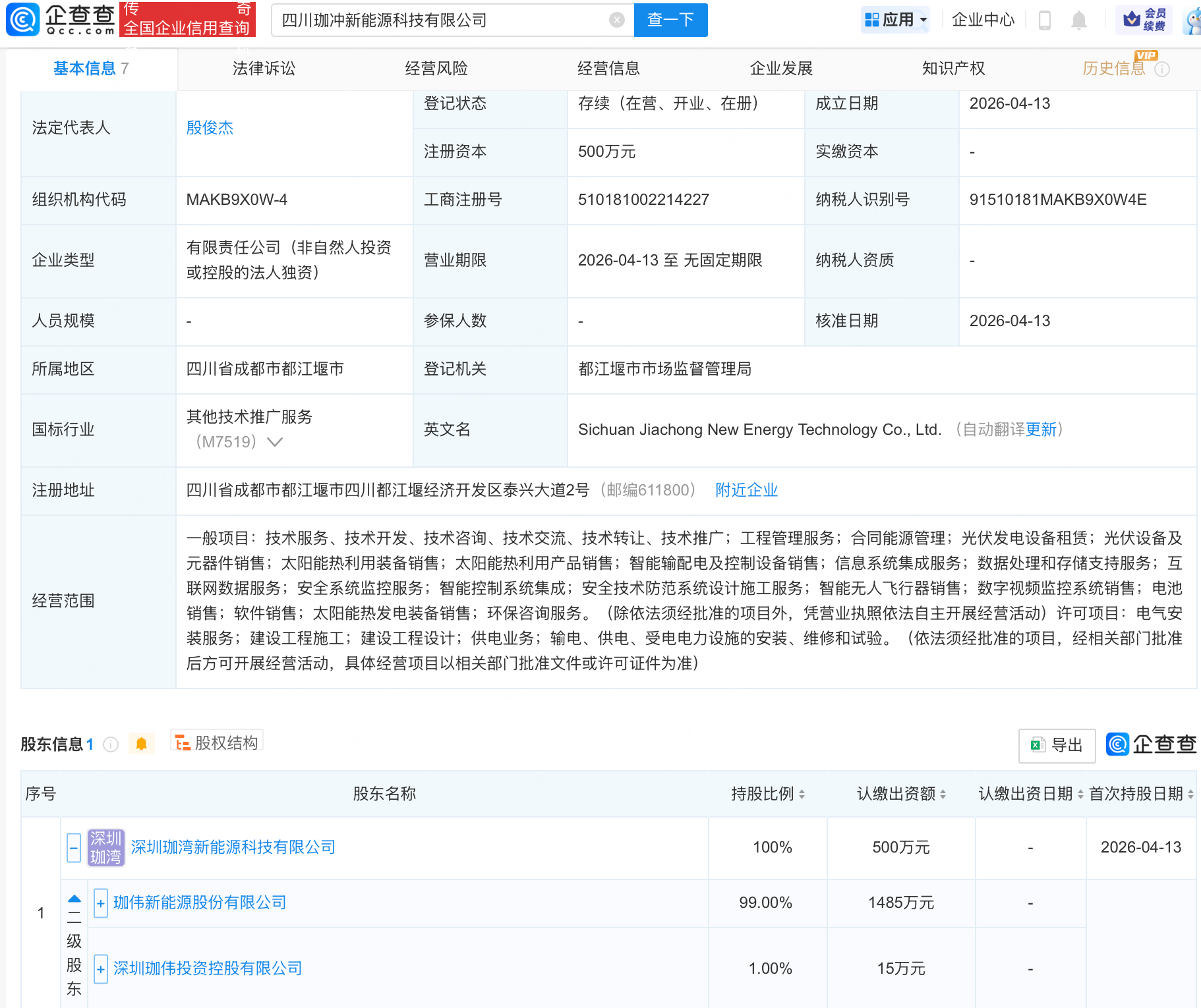企查查APP显示,近日,四川珈冲新能源科技有限公司成立,经营范围包含:安全技术防范系统设计施工服务;智能无人飞行器销售;数字视频监控系统销售;电池销售等。企查查股权穿透显示,该公司由珈伟新能(300317)旗下深圳珈湾新能源科技有限公司全资持股。