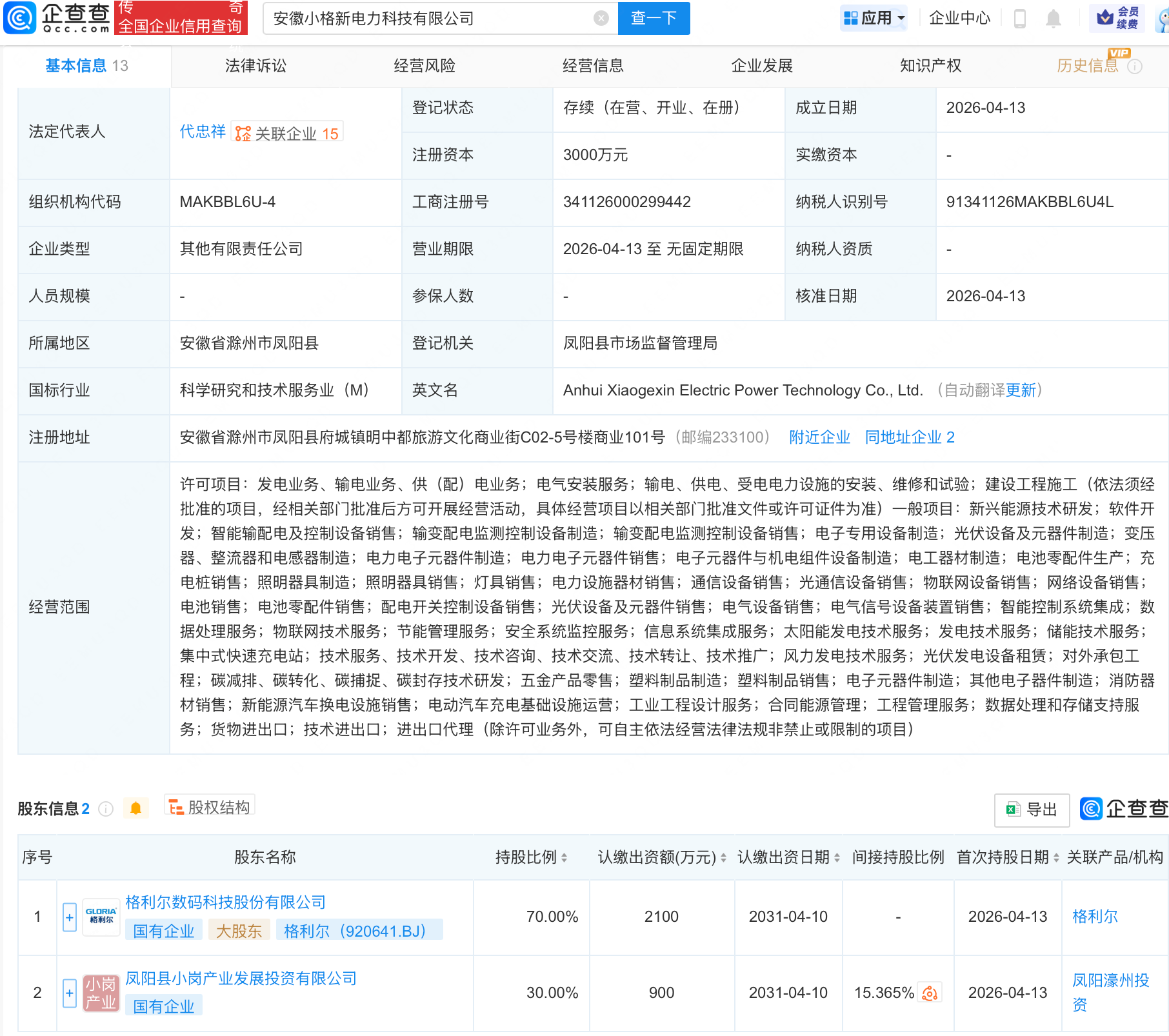 企查查APP显示,近日,安徽小格新电力科技有限公司成立,经营范围包含:物联网设备销售;储能技术服务;集中式快速充电站;碳减排、碳转化、碳捕捉、碳封存技术研发等。企查查股权穿透显示,该公司由格利尔(920641)等共同持股。
