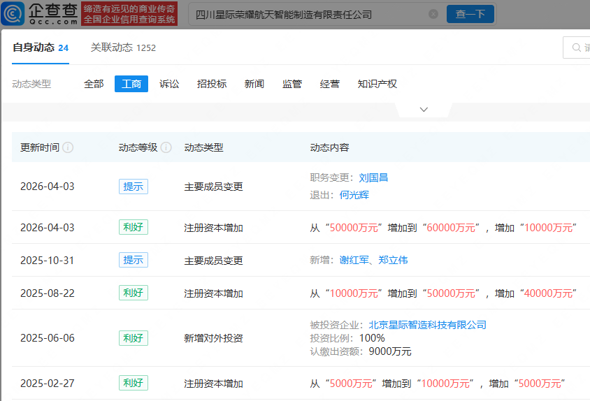 企查查APP显示,近日,四川星际荣耀航天智能制造有限责任公司发生工商变更,注册资本由5亿元增加至6亿元,此前,该公司已多次增资。