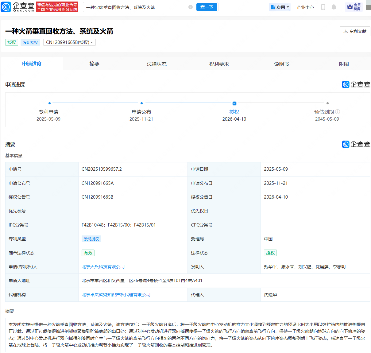 企查查APP显示,近日,北京天兵科技有限公司申请的“一种火箭垂直回收方法、系统及火箭”专利获授权。