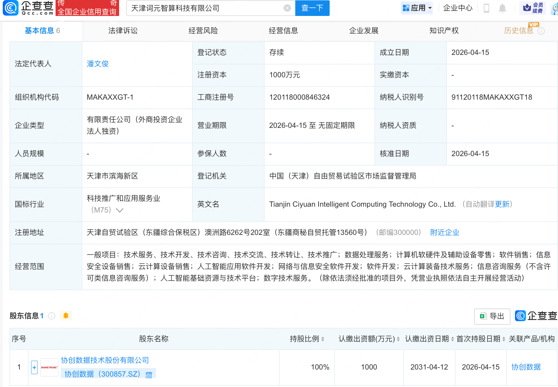 企查查APP显示,近日,天津词元智算科技有限公司成立,注册资本1000万元,经营范围包含:云计算设备销售;人工智能应用软件开发;网络与信息安全软件开发等。企查查股权穿透显示,该公司由协创数据(300857)全资持股。