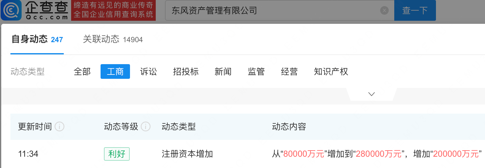东风汽车旗下资管公司增资至28亿,增幅250%