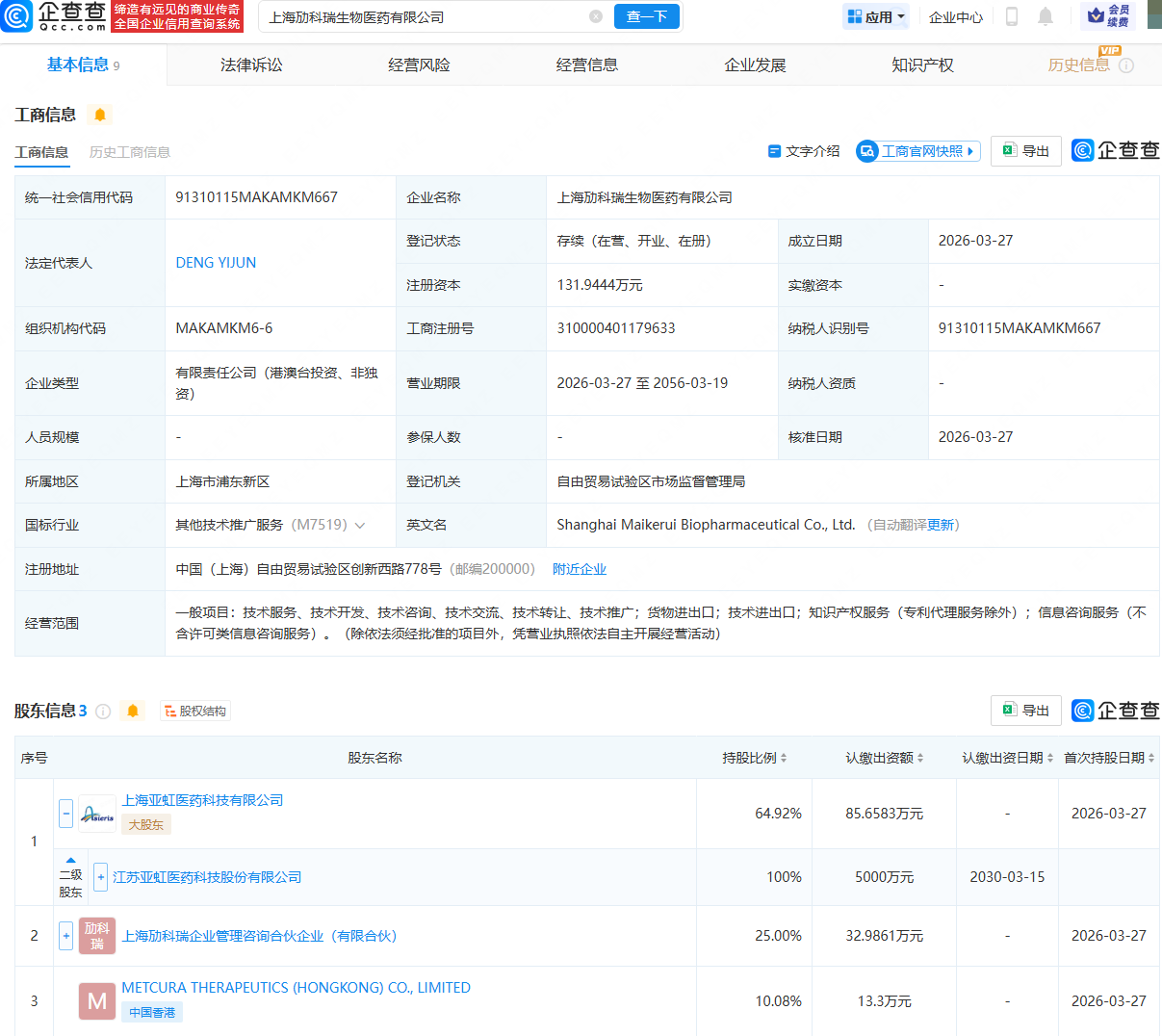 企查查APP显示,近日,上海劢科瑞生物医药有限公司成立,法定代表人为DENG YIJUN,经营范围包含:货物进出口;技术进出口;知识产权服务(专利代理服务除外)等。企查查股权穿透显示,该公司由亚虹医药(688176)全资子公司上海亚虹医药科技有限公司、上海劢科瑞企业管理咨询合伙企业(有限合伙)等共同持股。