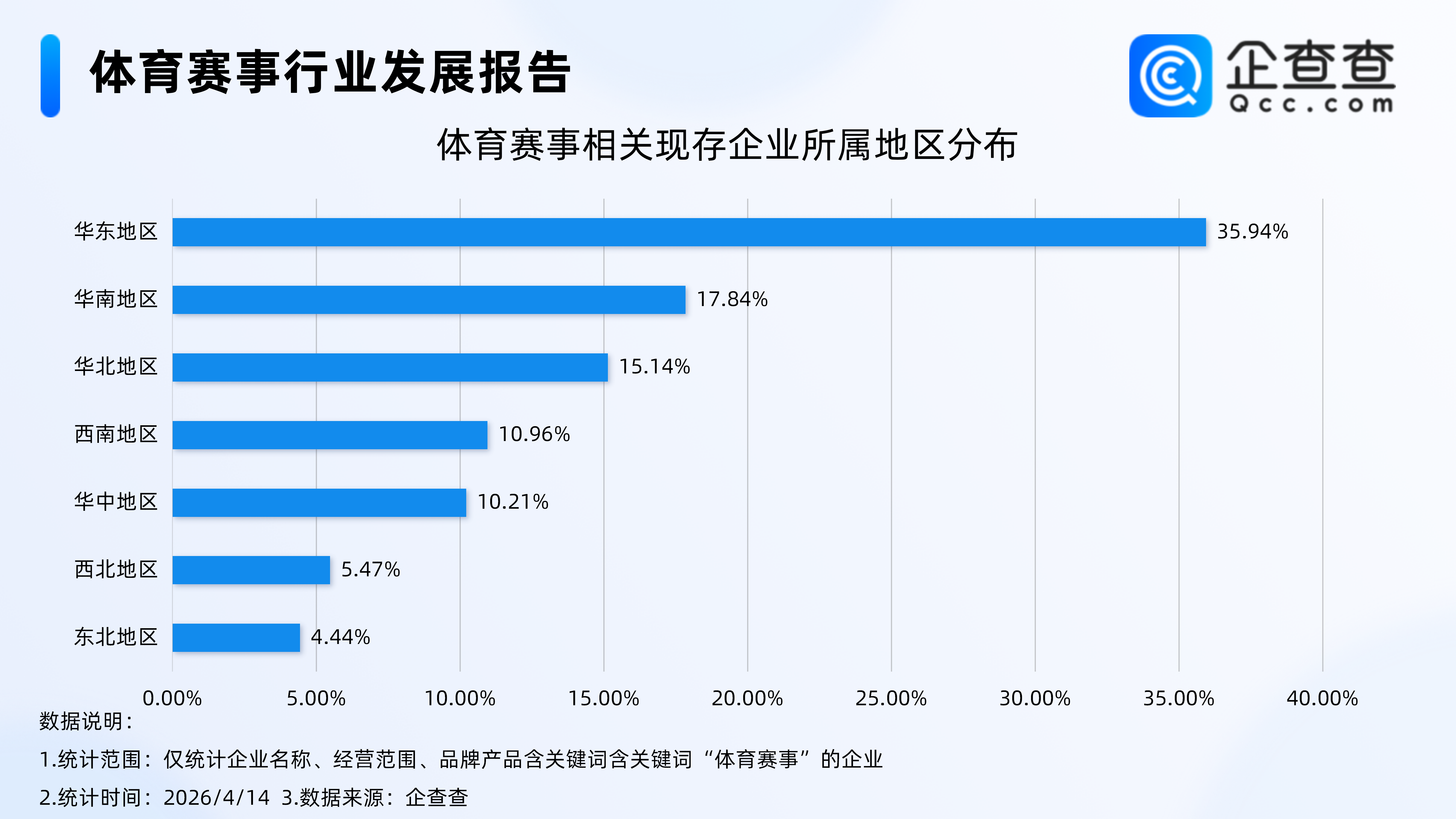 企查查数据显示,从区域存量分布看,华东地区以30.58万家体育赛事相关企业领先全国,占全国存量的35.94%;华南、华北地区分别以15.18万家、12.88万家紧随其后,分别占比17.84%、15.14%。