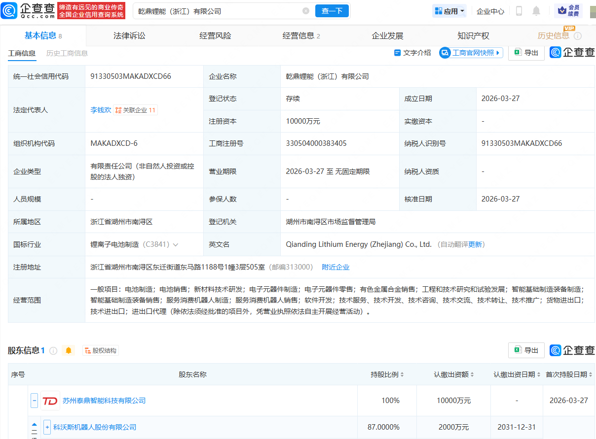 企查查APP显示,近日,乾鼎锂能(浙江)有限公司成立,法定代表人为李钱欢,注册资本为1亿元,经营范围包含:电池制造;电池销售;新材料技术研发;电子元器件制造;电子元器件零售;服务消费机器人制造等。企查查股权穿透显示,该公司由科沃斯(603486)控股的苏州泰鼎智能科技有限公司全资持股。