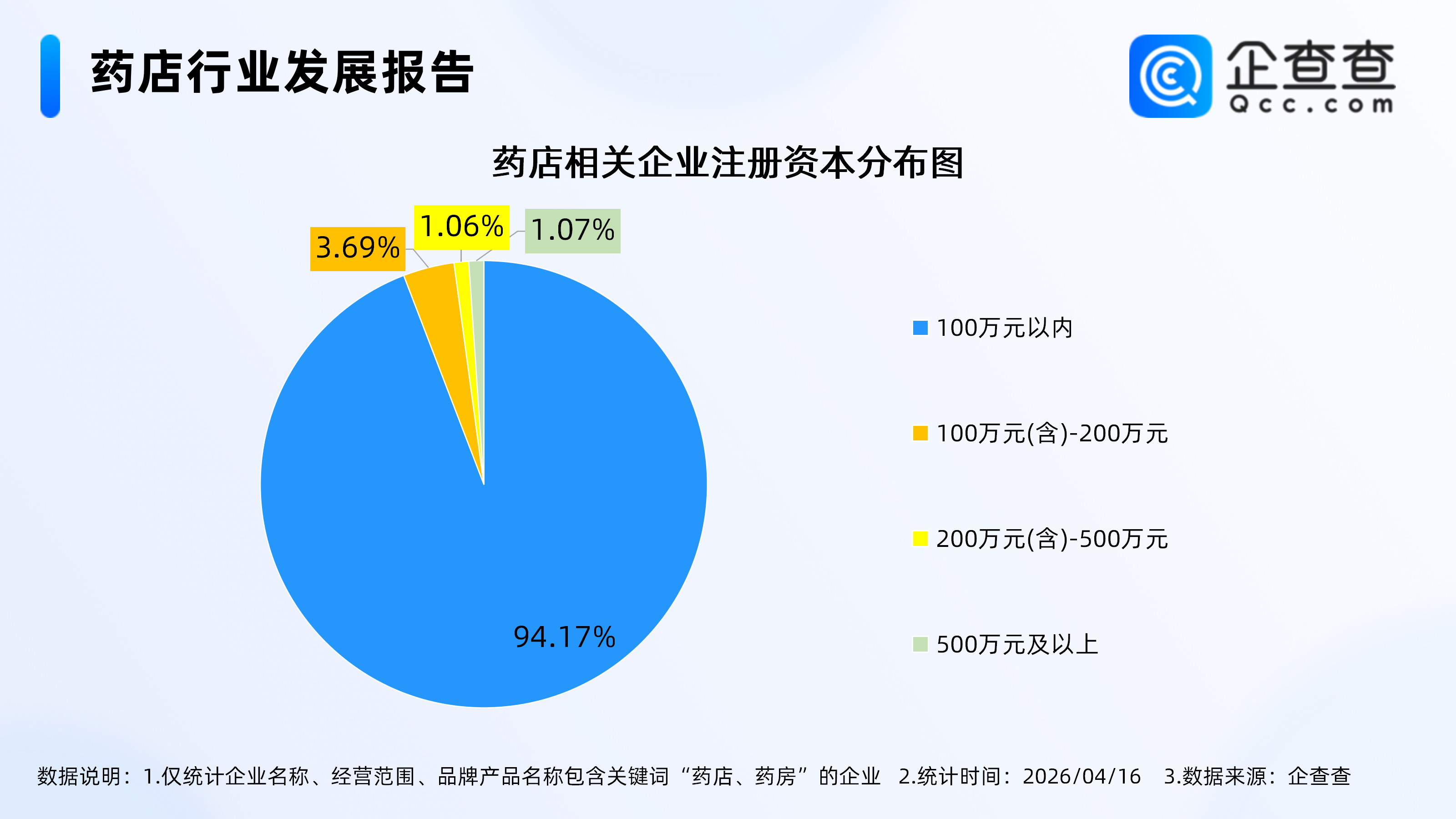 企查查数据显示,注册资本分布上,药店相关企业以轻量级企业为主,注册资本100万元以内的企业占比高达94.17%,行业主体以小微规模企业为主。其次,注册资本在100万元(含)-200万元企业占比3.69%,200万元(含)-500万元企业占比1.06%,500万元及以上企业占比仅1.07%。