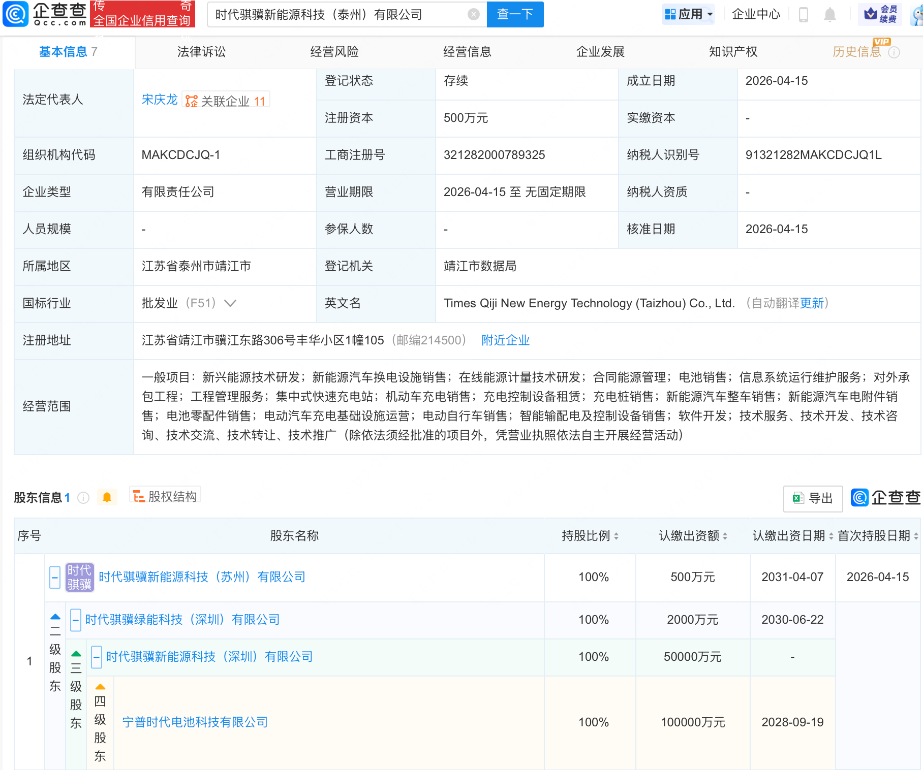 企查查APP显示,近日,时代骐骥新能源科技(泰州)有限公司成立,法定代表人为宋庆龙,经营范围包括新能源技术研发、新能源汽车换电设施销售、在线能源计量技术研发等,由宁德时代(300750)旗下时代骐骥新能源科技(苏州)有限公司全资持股。
