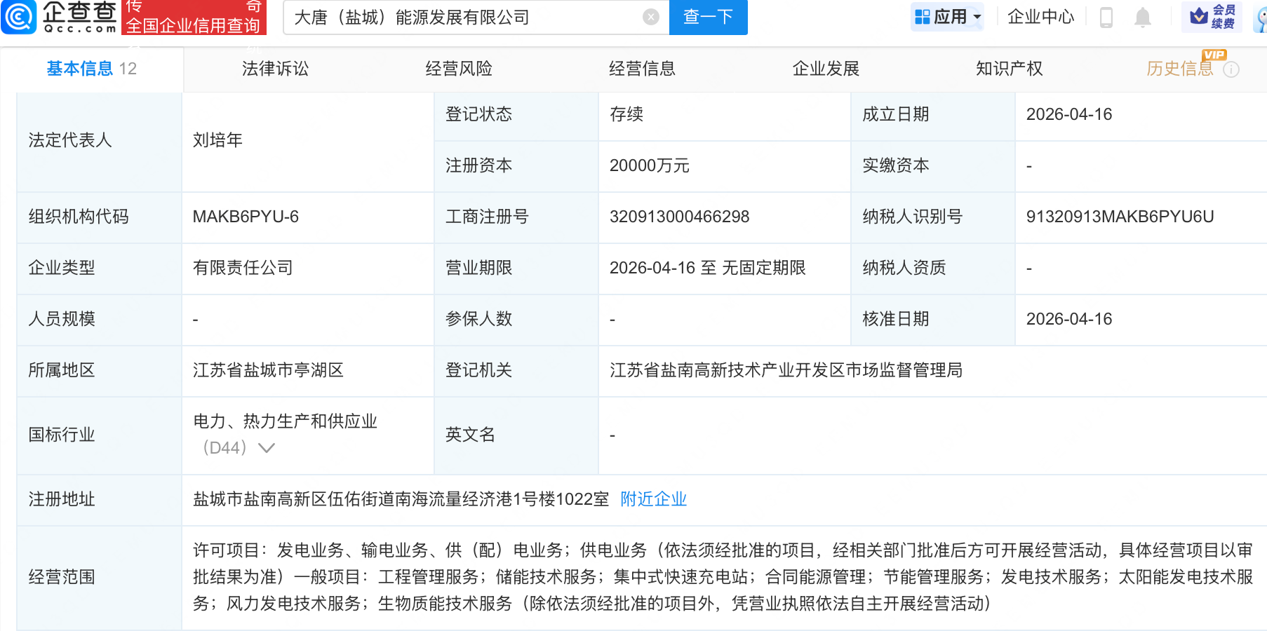 企查查APP显示,近日,大唐(盐城)能源发展有限公司成立,注册资本2亿元,经营范围包含:储能技术服务;集中式快速充电站;合同能源管理;节能管理服务;发电技术服务等。企查查股权穿透显示,该公司由中国大唐集团有限公司旗下大唐江苏售电有限公司、盐城市都市建设投资集团有限公司共同持股。
