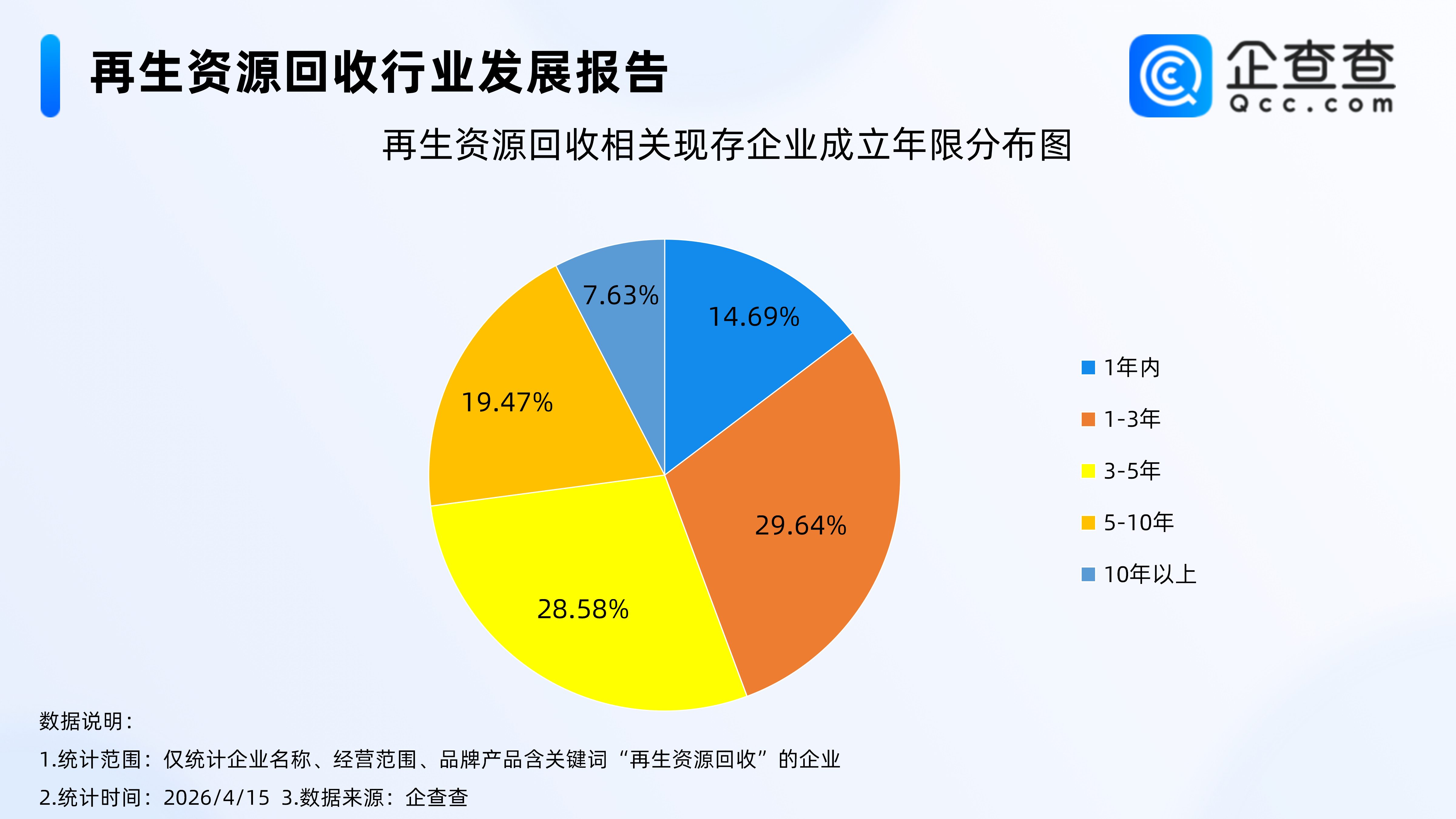 企查查数据显示,成立年限分布上,超7成相关企业成立于五年内,其中,成立1-3年的再生资源回收相关企业占比最高,达29.64%;成立3-5年相关企业占比28.58%。成立1年内的相关企业占比 14.69%。