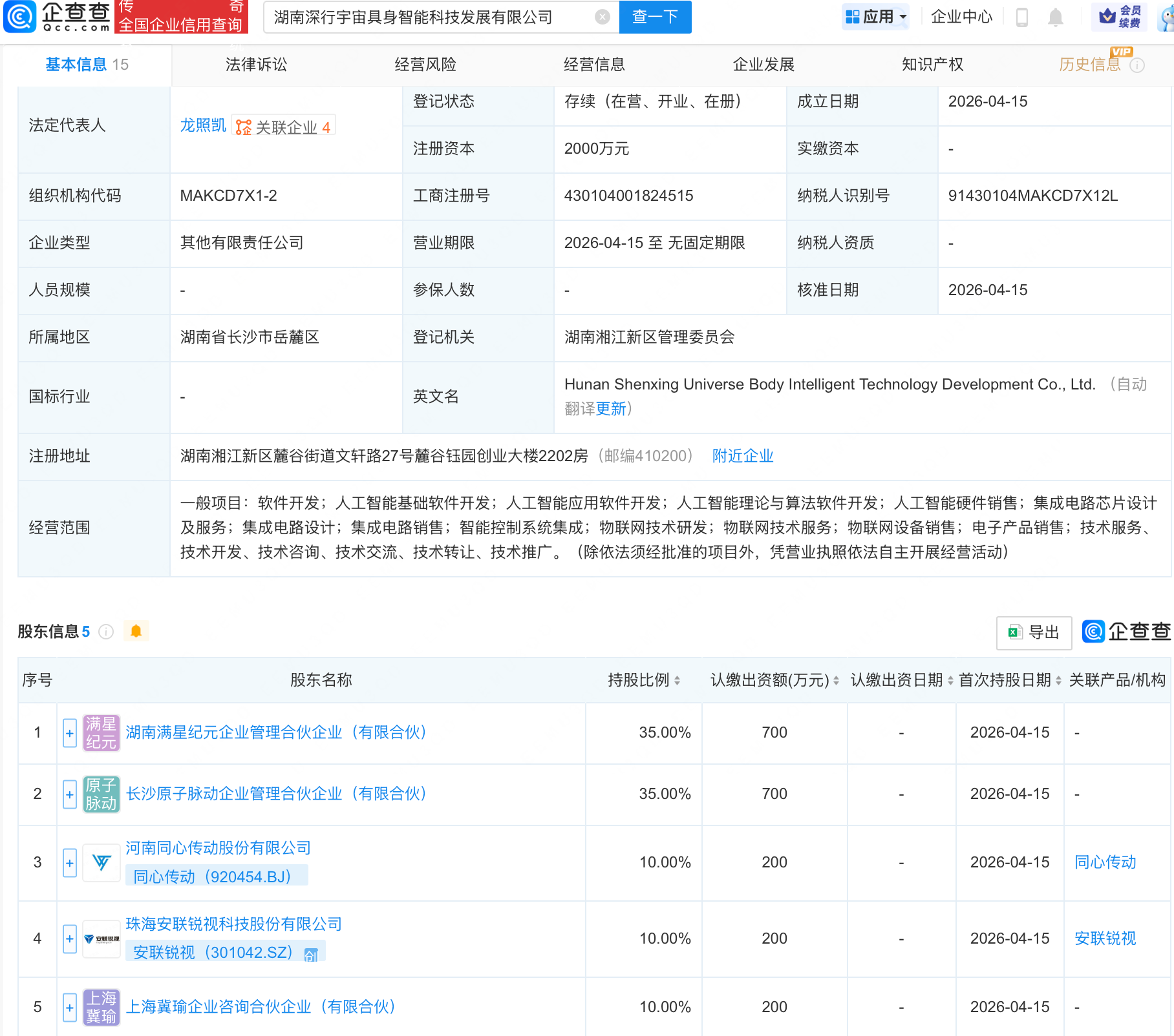 企查查APP显示,近日,湖南深行宇宙具身智能科技发展有限公司成立,注册资本2000万元,经营范围包含:人工智能应用软件开发;人工智能理论与算法软件开发;人工智能硬件销售;集成电路芯片设计及服务等。企查查股权穿透显示,该公司由同心传动(920454)、安联锐视(301042)等共同持股。