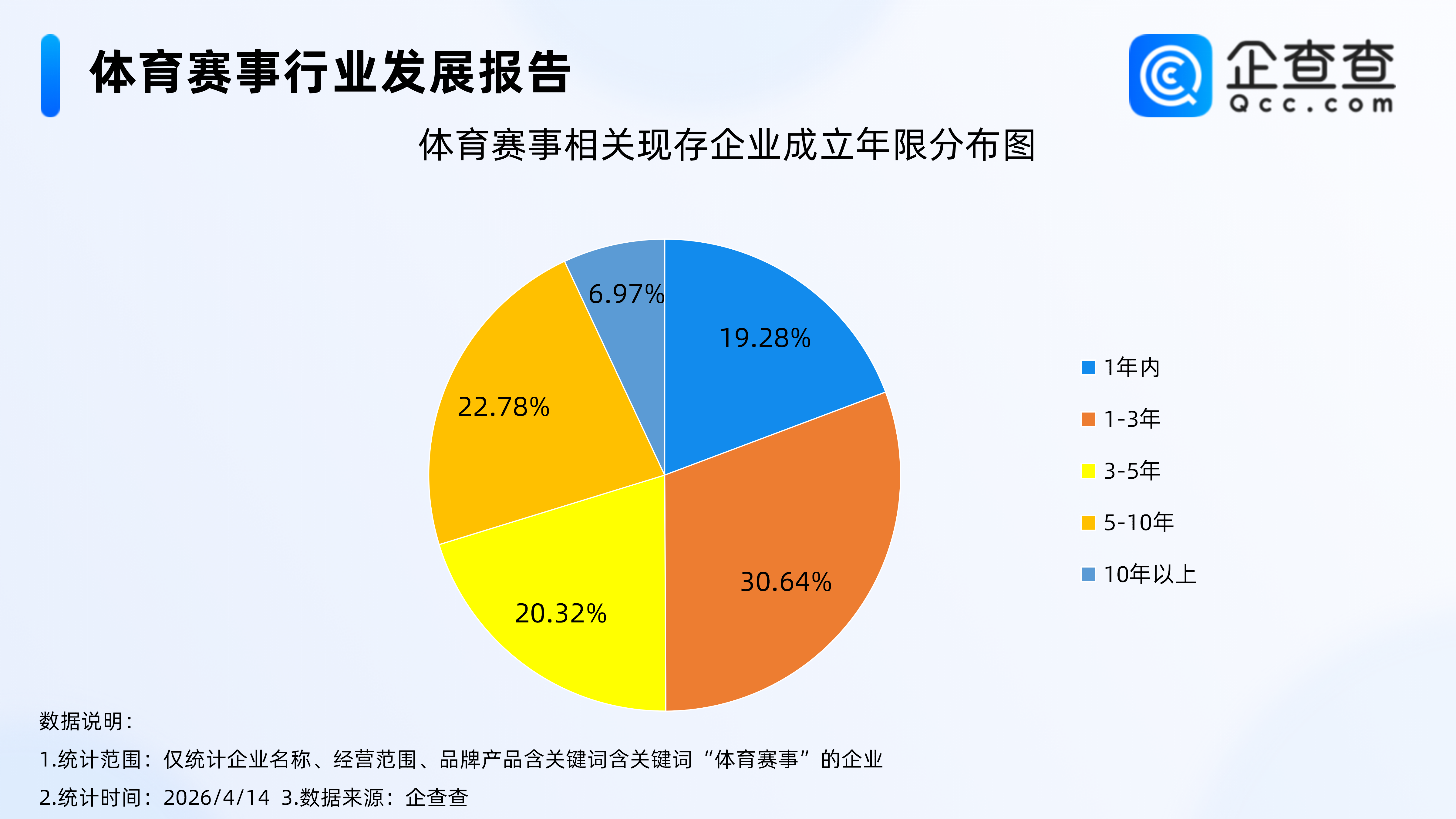 企查查数据显示,从成立年限分布看,国内体育赛事相关企业成立年限分布较为均匀,其中成立1-3年的体育赛事相关企业占比达30.64%,为各年限区间最高。成立5-10年的企业占比22.78%,成立3-5年的企业占比20.32%,成立1年以内的企业占比19.28%。