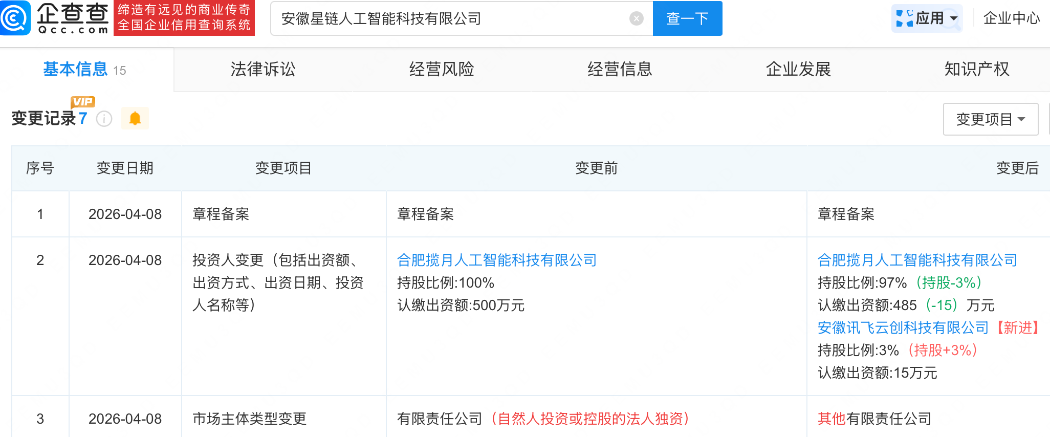 企查查APP显示,近日,安徽星链人工智能科技有限公司发生工商变更,新增科大讯飞(002230)全资子公司安徽讯飞云创科技有限公司为股东。企查查信息显示,该公司成立于2026年2月,经营范围包含:人工智能应用软件开发;人工智能基础软件开发;人工智能通用应用系统;人工智能硬件销售等。