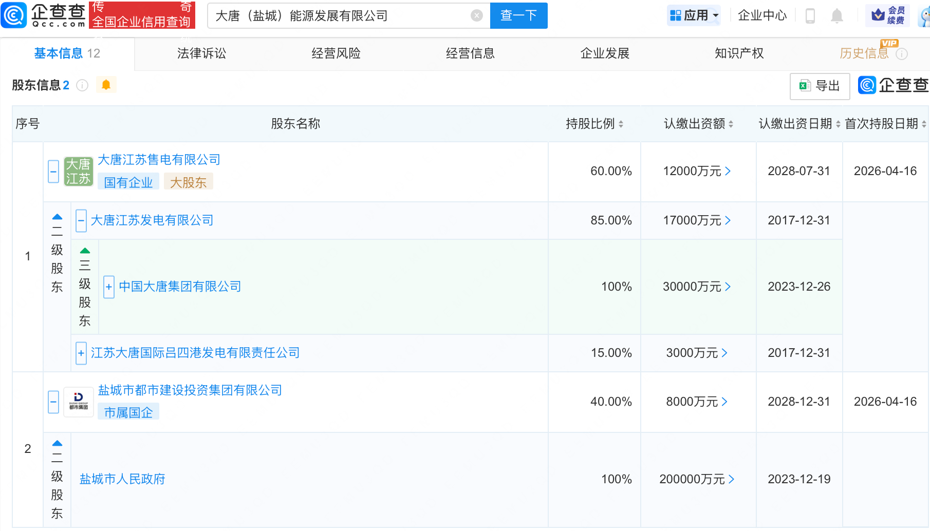 企查查APP显示,近日,大唐(盐城)能源发展有限公司成立,注册资本2亿元,经营范围包含:储能技术服务;集中式快速充电站;合同能源管理;节能管理服务;发电技术服务等。企查查股权穿透显示,该公司由中国大唐集团有限公司旗下大唐江苏售电有限公司、盐城市都市建设投资集团有限公司共同持股。