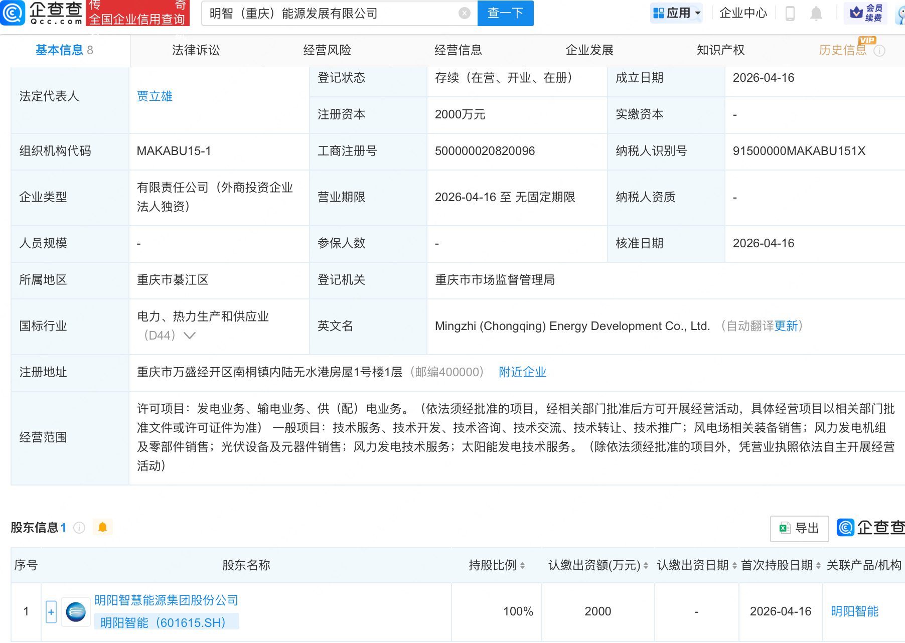 企查查APP显示,近日,明智(重庆)能源发展有限公司成立,注册资本2000万元,经营范围包含:风电场相关装备销售;风力发电机组及零部件销售;光伏设备及元器件销售等。企查查股权穿透显示,该公司由明阳智能(601615)全资持股。