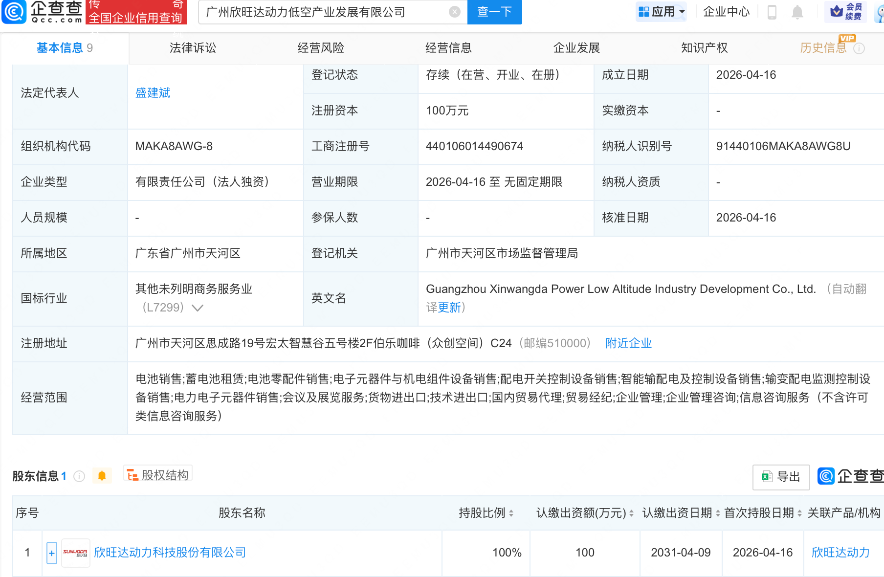 企查查APP显示,近日,广州欣旺达动力低空产业发展有限公司成立,经营范围包含:电池销售;蓄电池租赁;电池零配件销售;电子元器件与机电组件设备销售等。企查查股权穿透显示,该公司由欣旺达动力科技股份有限公司全资持股。