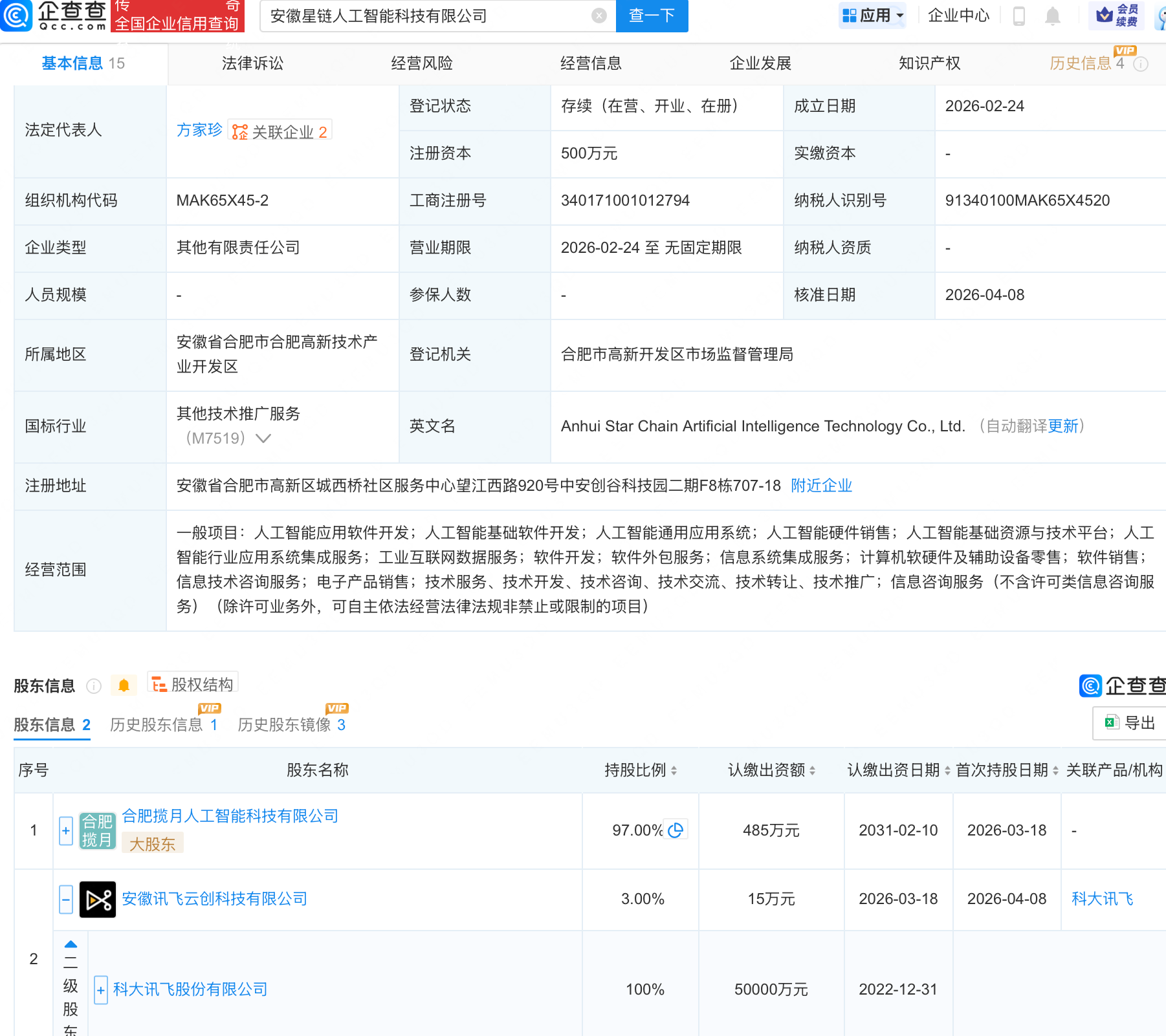 企查查APP显示,近日,安徽星链人工智能科技有限公司发生工商变更,新增科大讯飞(002230)全资子公司安徽讯飞云创科技有限公司为股东。企查查信息显示,该公司成立于2026年2月,经营范围包含:人工智能应用软件开发;人工智能基础软件开发;人工智能通用应用系统;人工智能硬件销售等。