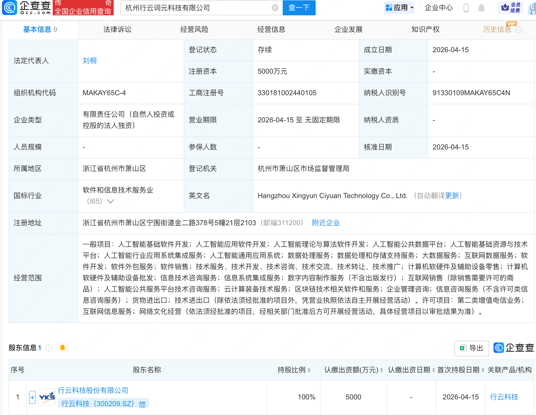 企查查APP显示,近日,杭州行云词元科技有限公司成立,注册资本5000万元,经营范围包含:人工智能基础软件开发;人工智能应用软件开发;人工智能理论与算法软件开发;人工智能公共数据平台等。企查查股权穿透显示,该公司由行云科技(300209)全资持股。