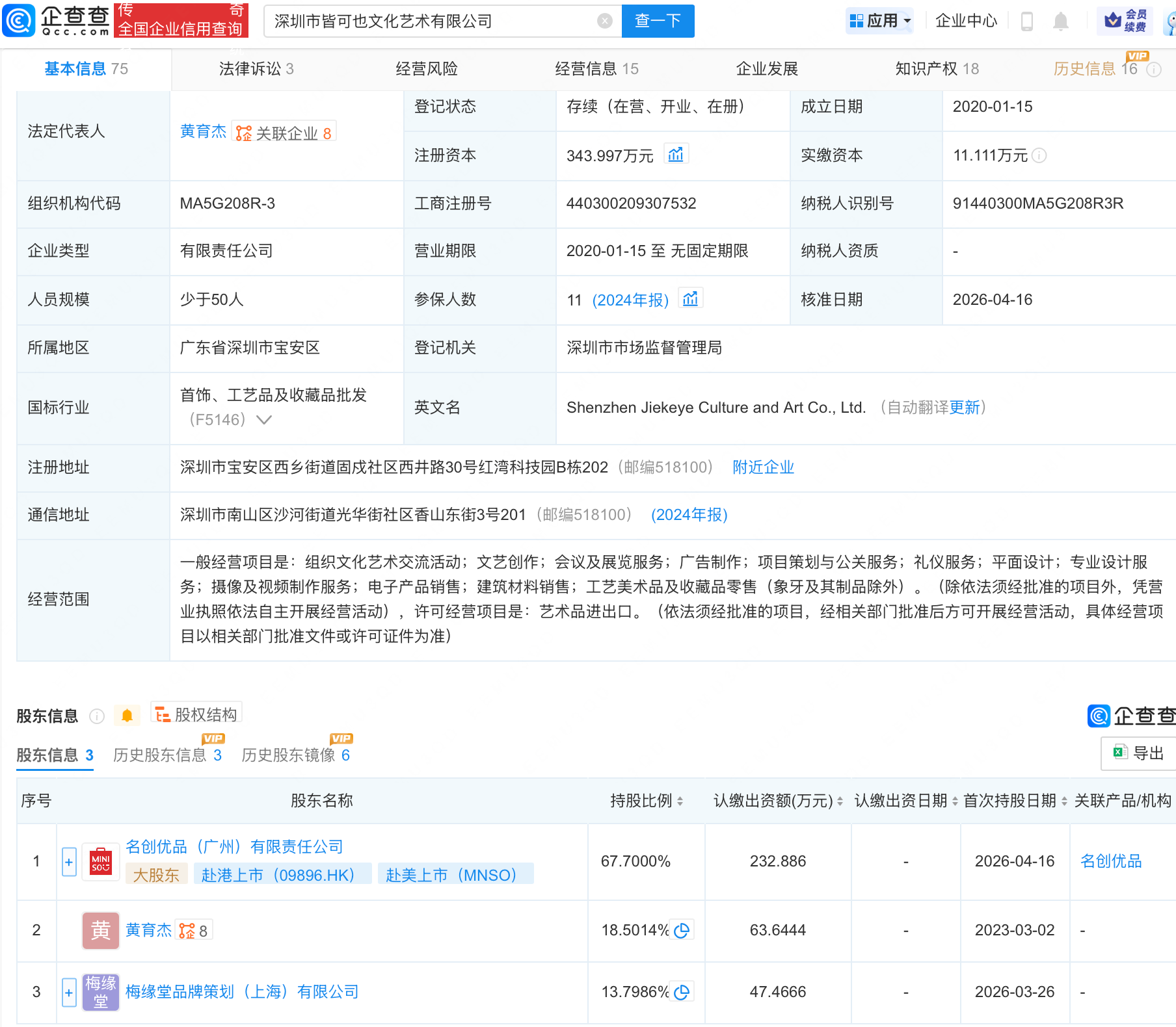 企查查APP显示,近日,深圳市皆可也文化艺术有限公司发生工商变更,新增名创优品(广州)有限责任公司为大股东,持股67.7%,同时注册资本增至343.997万元。企查查信息显示,该公司成立于2020年,经营范围包含:平面设计;专业设计服务;摄像及视频制作服务;电子产品销售等。
