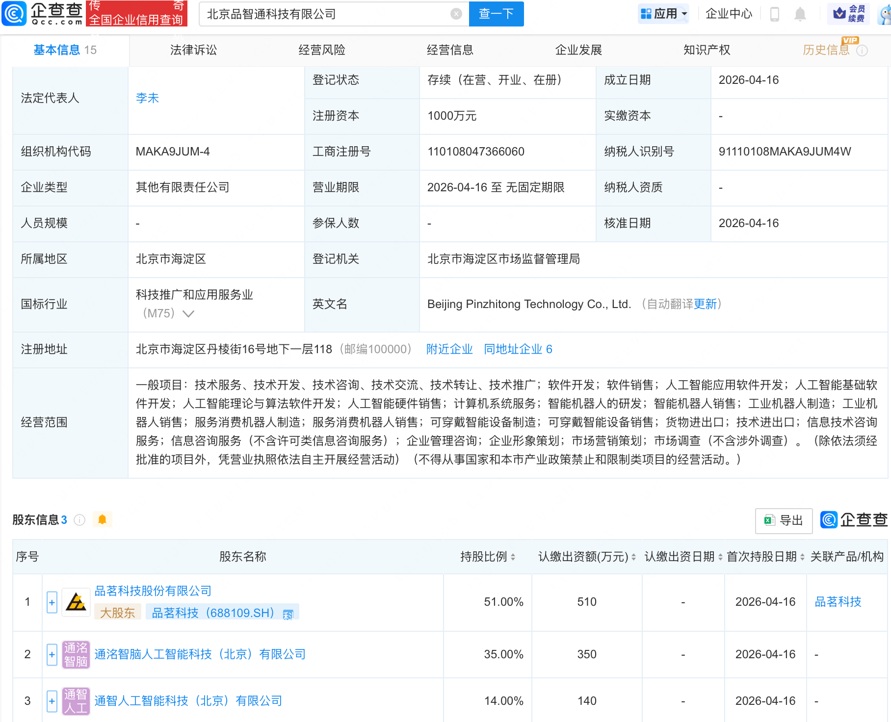 企查查APP显示,近日,北京品智通科技有限公司成立,经营范围包含:人工智能理论与算法软件开发;人工智能硬件销售;智能机器人的研发;智能机器人销售等。企查查股权穿透显示,该公司由品茗科技(688109)等共同持股。