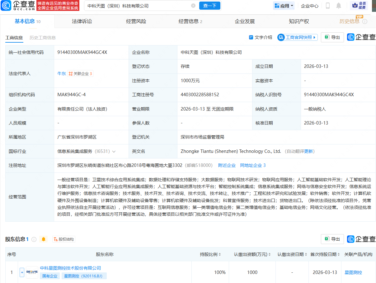 企查查APP显示,近日,中科天图(深圳)科技有限公司成立,法定代表人为牛东,注册资本为1000万元,经营范围包含:卫星技术综合应用系统集成;数据处理和存储支持服务;人工智能基础软件开发;人工智能理论与算法软件开发等。企查查股权穿透显示,该公司由星图测控(920116)全资持股。