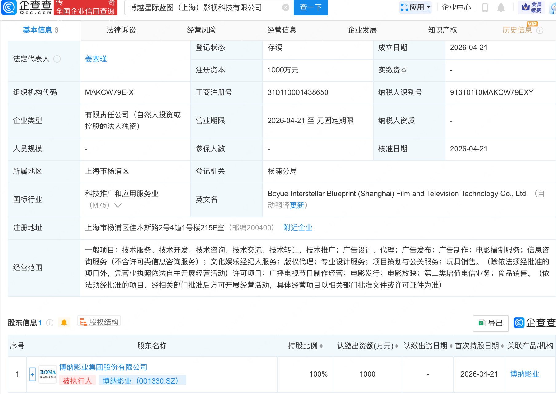 企查查APP显示,近日,博越星际蓝图(上海)影视科技有限公司成立,经营范围包含:文化娱乐经纪人服务;版权代理;专业设计服务;项目策划与公关服务等。企查查股权穿透显示,该公司由博纳影业(001330)全资持股。