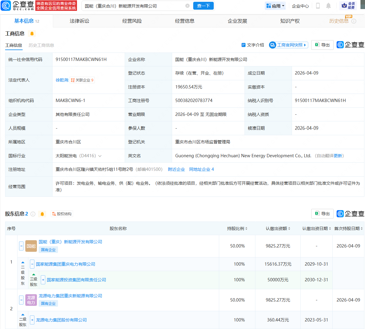 企查查APP显示,近日,国能(重庆合川)新能源开发有限公司成立,法定代表人为徐乾尧,注册资本为1.97亿元,经营范围包含:发电业务、输电业务、供(配)电业务。企查查股权穿透显示,该公司由龙源电力(001289)全资子公司龙源电力集团重庆新能源有限公司、国家能源投资集团有限责任公司旗下国能(重庆)新能源开发有限公司共同持股。