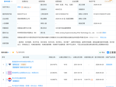 企查查APP显示,近日,贵州钧海新能源有限公司成立,法定代表人为李宝亮,注册资本为2000万元,经营范围包含:风力发电技术服务;发电技术服务;储能技术服务;供电业务;电气安装服务等。企查查股权穿透显示,该公司由申能股份(600642)间接全资持股。