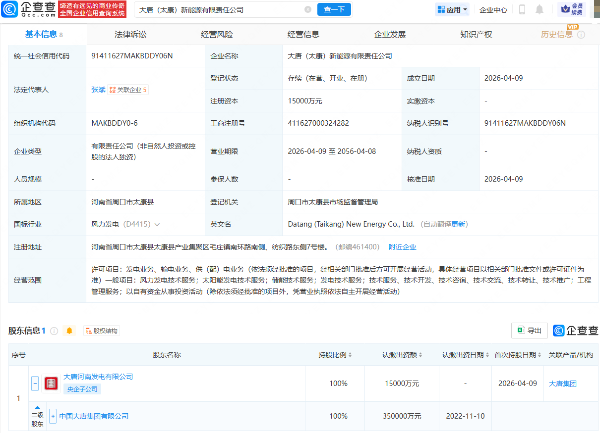 企查查APP显示,近日,大唐(太康)新能源有限责任公司成立,法定代表人为张斌,注册资本为1.5亿元,经营范围包含:发电业务、输电业务、供(配)电业务;太阳能发电技术服务;储能技术服务;发电技术服务等。企查查股权穿透显示,该公司由中国大唐集团有限公司间接全资持股。