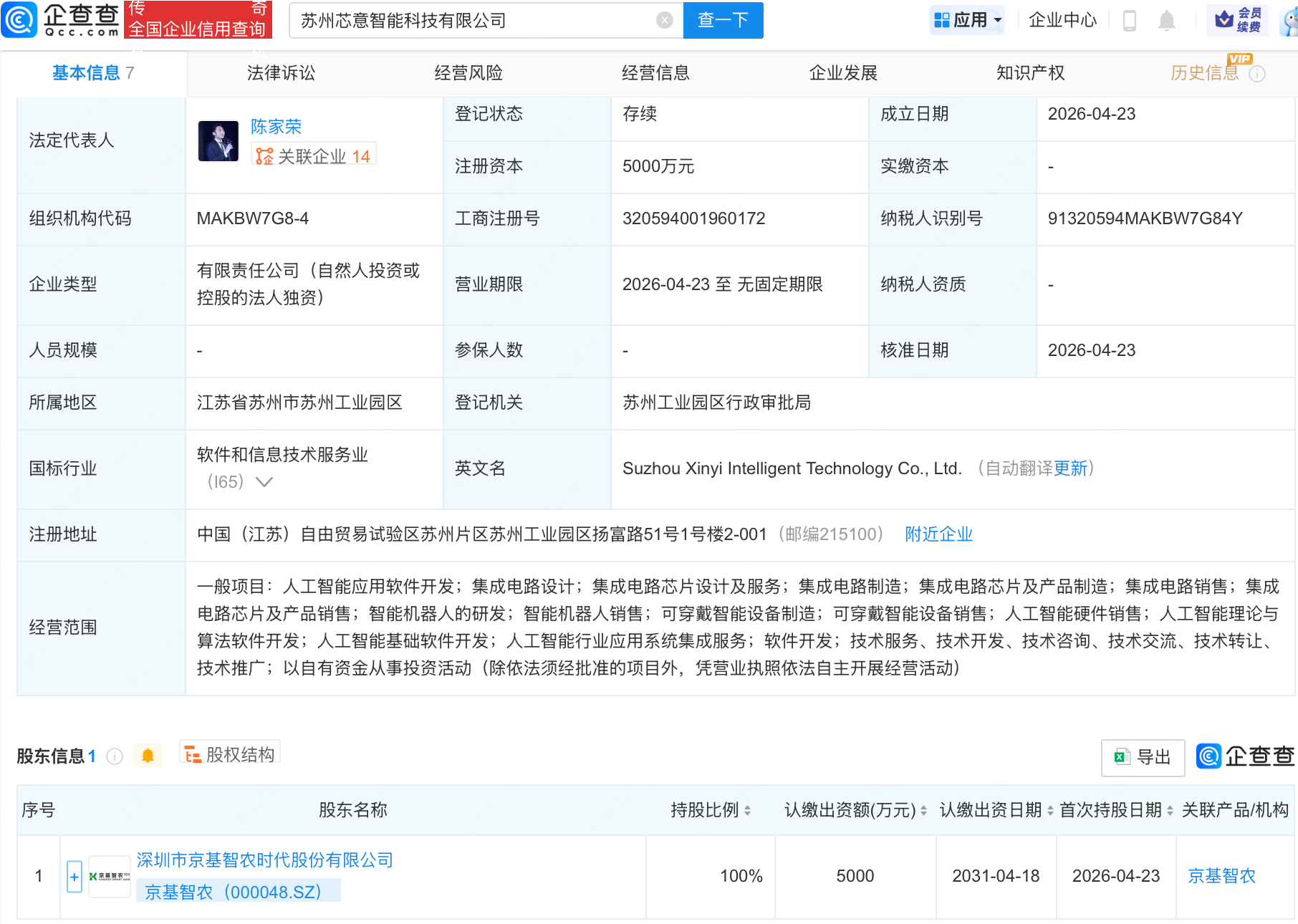企查查APP显示,近日,苏州芯意智能科技有限公司成立,注册资本5000万元,经营范围包含:人工智能应用软件开发;集成电路设计;集成电路芯片设计及服务;智能机器人的研发等。企查查股权穿透显示,该公司由京基智农(000048)全资持股。