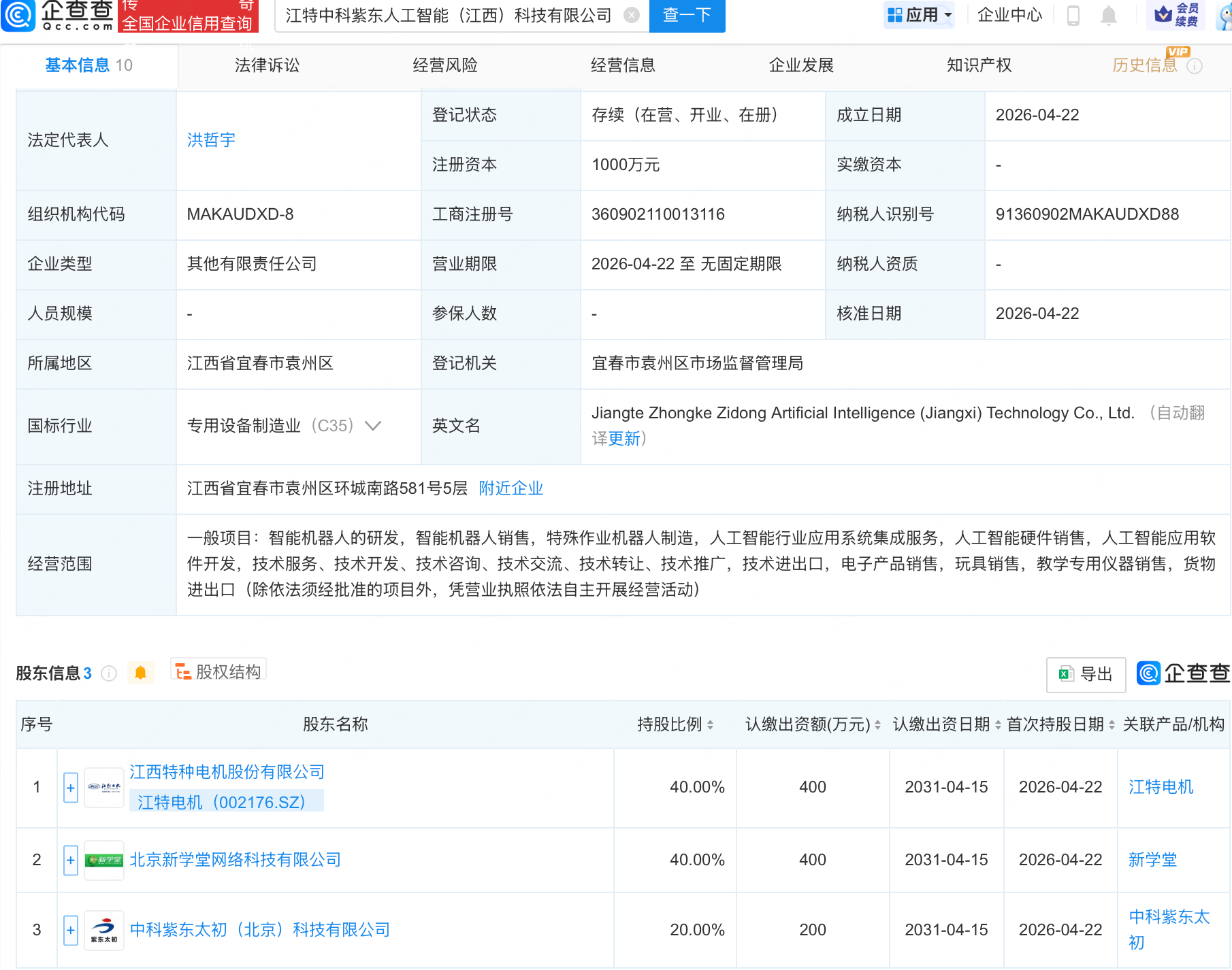企查查APP显示,近日,江特中科紫东人工智能(江西)科技有限公司成立,经营范围包含:智能机器人的研发,智能机器人销售,特殊作业机器人制造,人工智能行业应用系统集成服务等。企查查股权穿透显示,该公司由江特电机(002176)等共同持股。