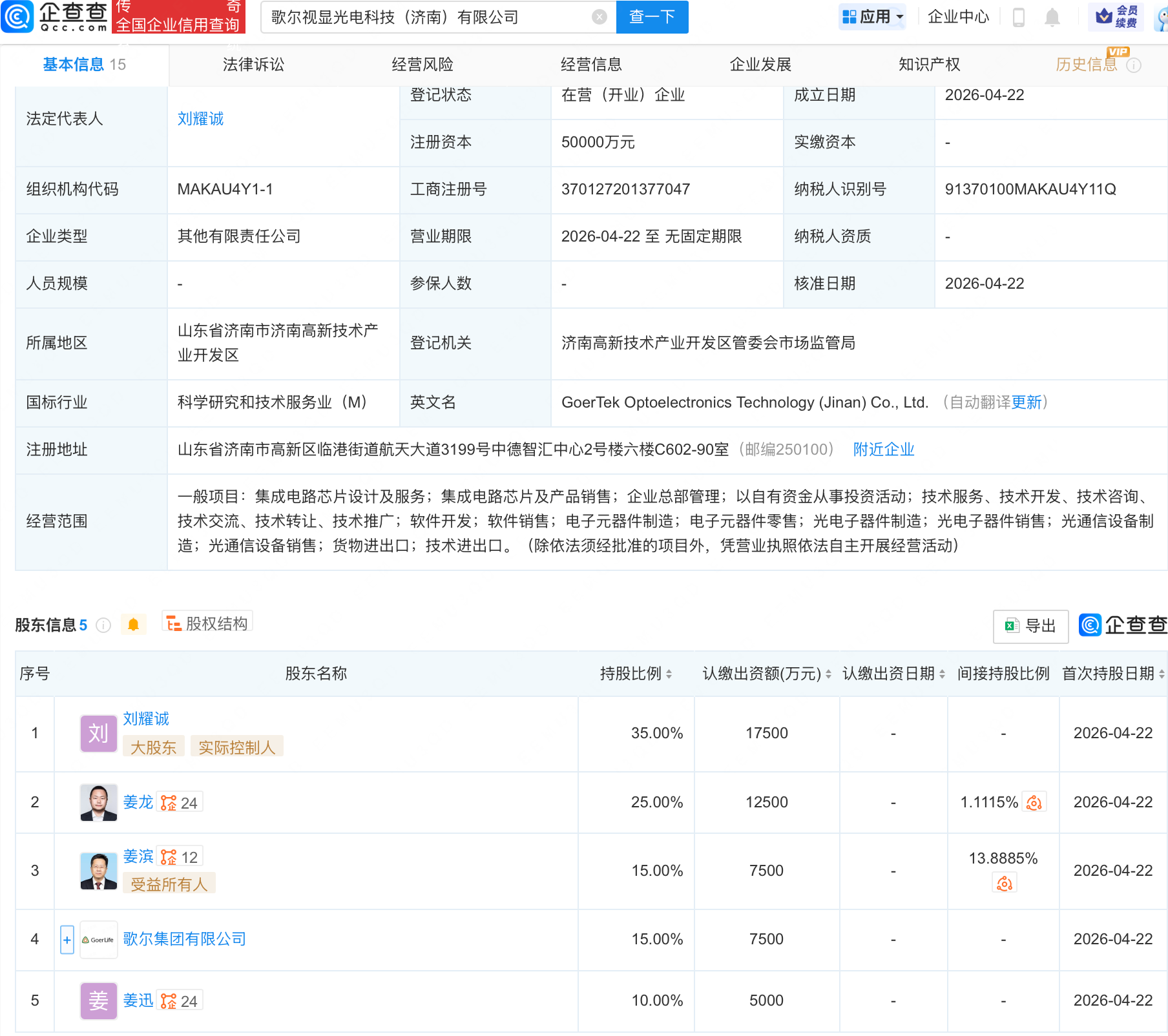 企查查APP显示,近日,歌尔视显光电科技(济南)有限公司成立,注册资本5亿元,经营范围包含:集成电路芯片设计及服务;集成电路芯片及产品销售;企业总部管理;以自有资金从事投资活动等。企查查股权穿透显示,该公司由歌尔集团有限公司等共同持股。