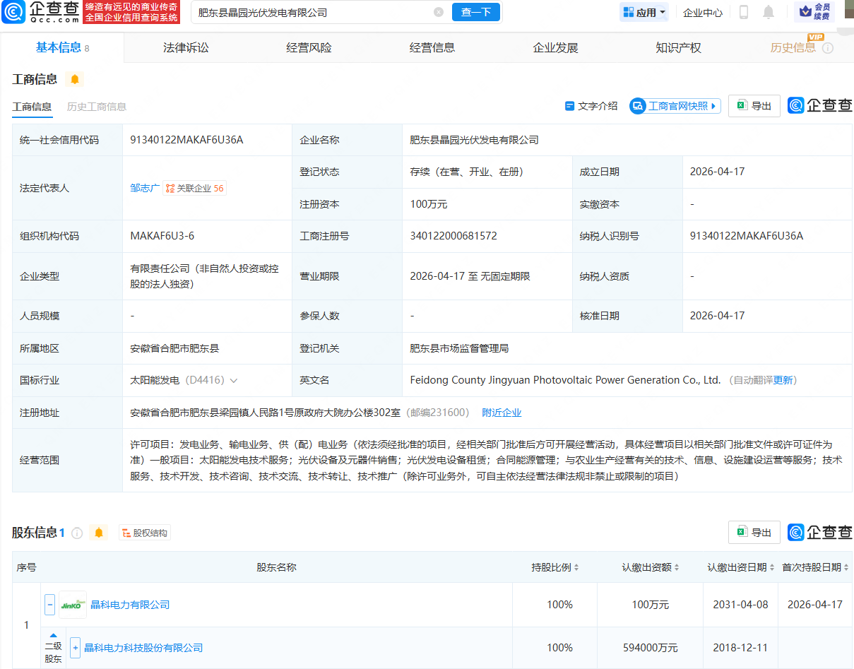 企查查APP显示,近日,肥东县晶园光伏发电有限公司、肥东县晶万光伏发电有限公司成立,法定代表人均为邹志广,经营范围均包含:发电业务、输电业务、供(配)电业务;太阳能发电技术服务;光伏设备及元器件销售等。企查查股权穿透显示,两公司均由晶科科技(601778)间接全资持股。
