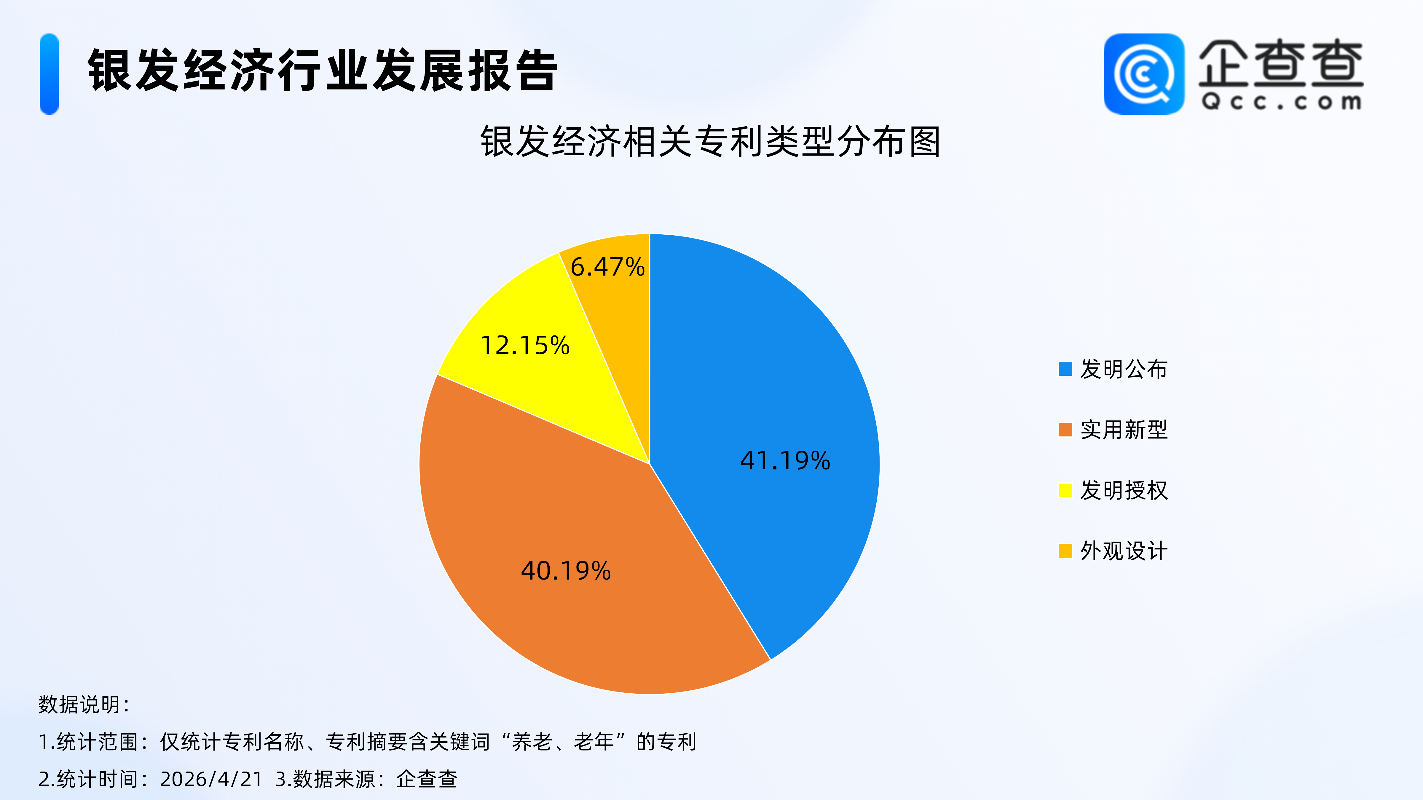 企查查数据显示,专利方面,国内现存银发经济相关专利4.9万项。从专利类型分布来看,发明专利最多,合计占比超5成,其中发明公布专利占比41.19%、发明授权专利占比12.15%。此外实用新型专利占比达40.19%。