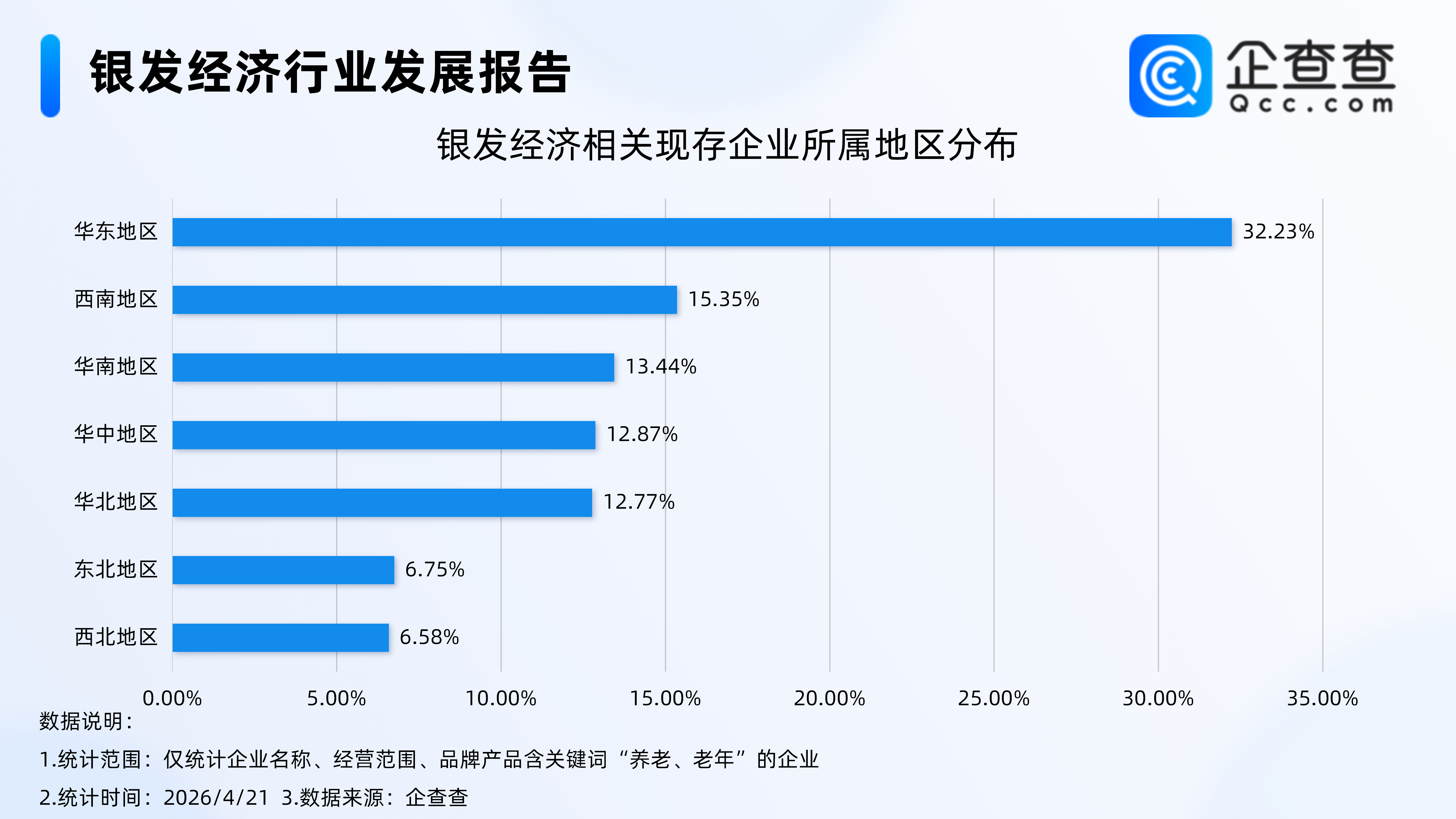 企查查数据显示,截至2026年4月21日,国内现存银发经济相关企业57.11万家,主要分布在华东地区、西南地区,分别占比32.23%、15.35%。华南、华中、华北三大地区占比均在12%—14%之间。相比之下,东北地区、西北地区占比相对最低,分别为6.75%、6.58%。华东地区依托长三角庞大的老龄人口基数与完善的服务产业链,成为银发经济相关企业最为集聚的区域。