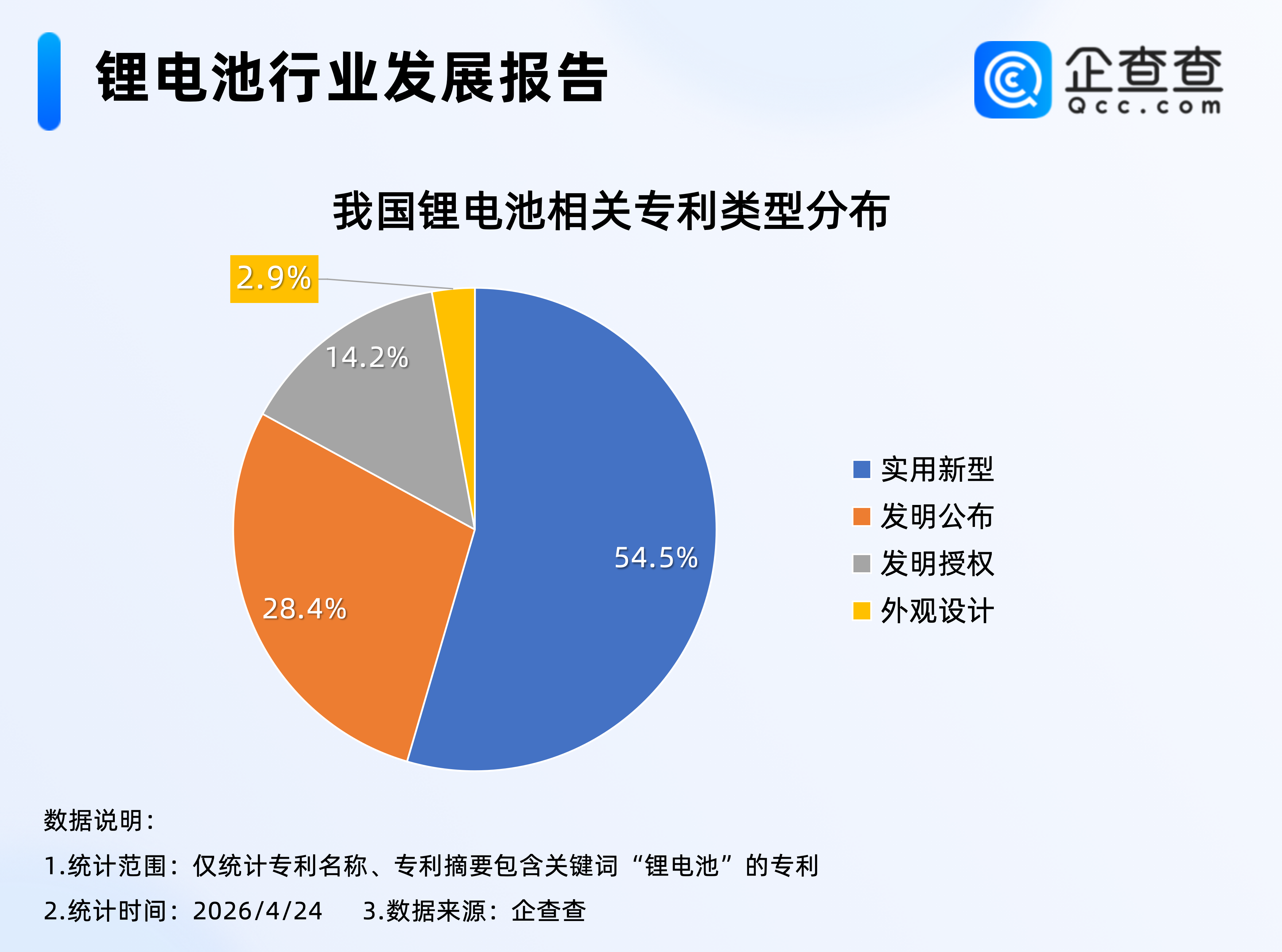 企查查数据显示,截至2026年4月24日,我国现有14.9万项锂电池相关专利,类型上以实用新型为主,占比54.5%,其次是发明公布,占比28.4%。2026年以来,我国已申请457项锂电池相关专利。