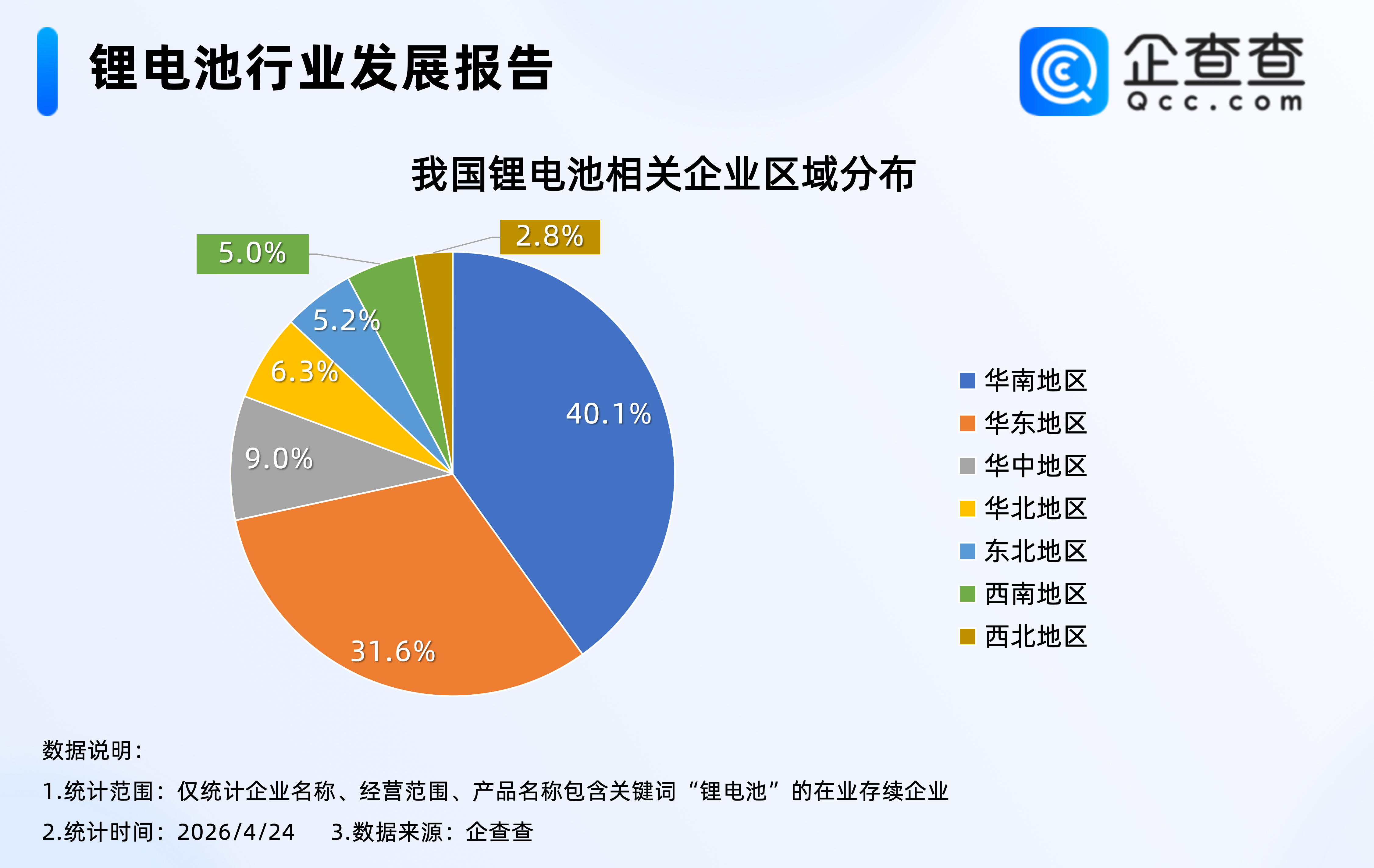 企查查数据显示,截至4月24日,我国现存1.7万家锂电池相关企业,区域分布上,华南地区占比超四成,达40.1%,其次是华东地区,占比31.6%,西南、西北地区锂电池相关企业存量相对最少,分别占比5.0%、2.8%。