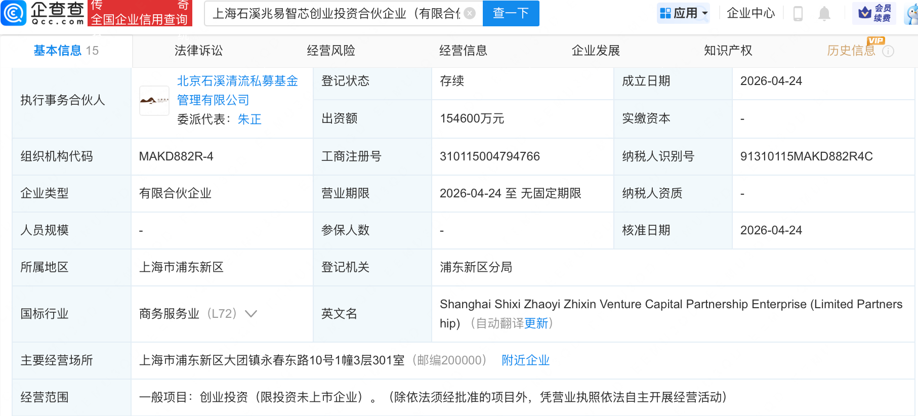 企查查APP显示,近日,上海石溪兆易智芯创业投资合伙企业(有限合伙)成立,出资额15.46亿元,经营范围包含:创业投资(限投资未上市企业)。企查查股权穿透显示,该企业由精智达(688627)、兆易创新(603986)等共同出资。