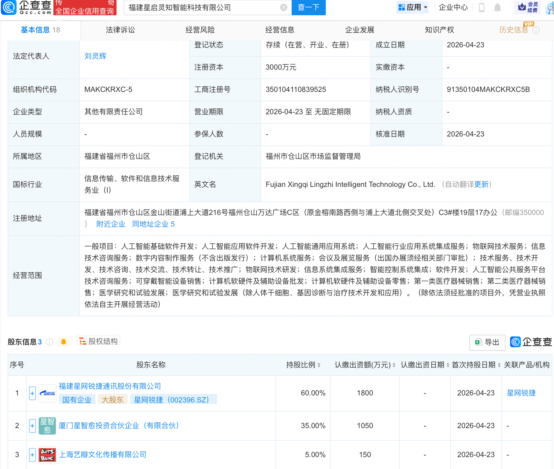 企查查APP显示,近日,福建星启灵知智能科技有限公司成立,注册资本3000万元,经营范围包含:人工智能基础软件开发;人工智能应用软件开发;人工智能通用应用系统;人工智能行业应用系统集成服务;物联网技术服务等。企查查股权穿透显示,该公司由星网锐捷(002396)等共同持股。