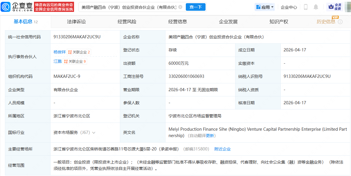 企查查APP显示,近日,美翊产融四合(宁波)创业投资合伙企业(有限合伙)成立,出资额6亿元,经营范围包含:创业投资。企查查股权穿透显示,该合伙企业由浙江自贸区(宁波)新动能产业投资基金合伙企业(有限合伙)、宁波通商创业投资合伙企业(有限合伙)、美的集团(000333)旗下美的创业投资管理有限公司等共同持股。