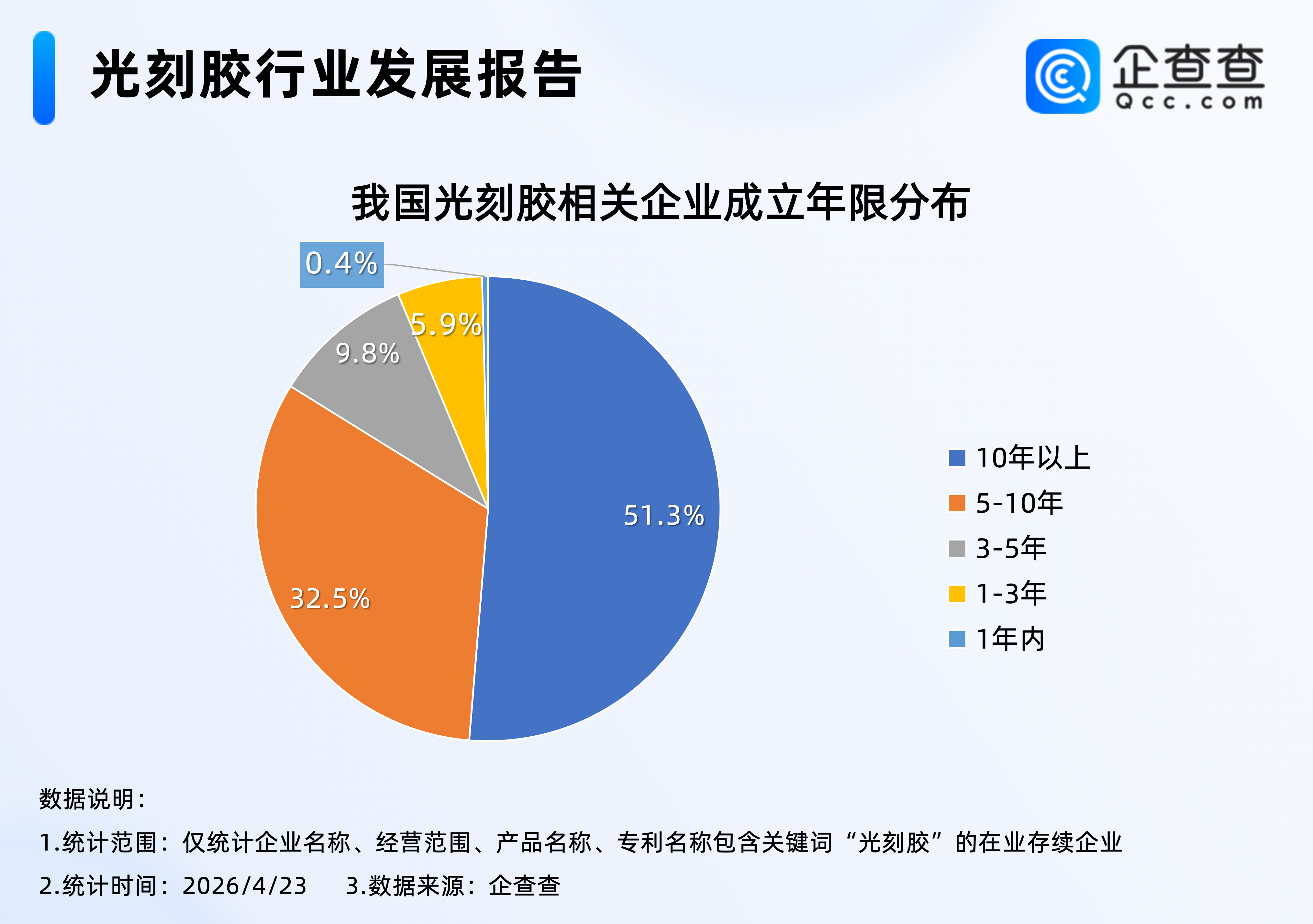 企查查数据显示,成立年限上,我国光刻胶领域多为老牌企业,超八成企业成立5年以上,其中成立10年以上的企业占比达51.3%。