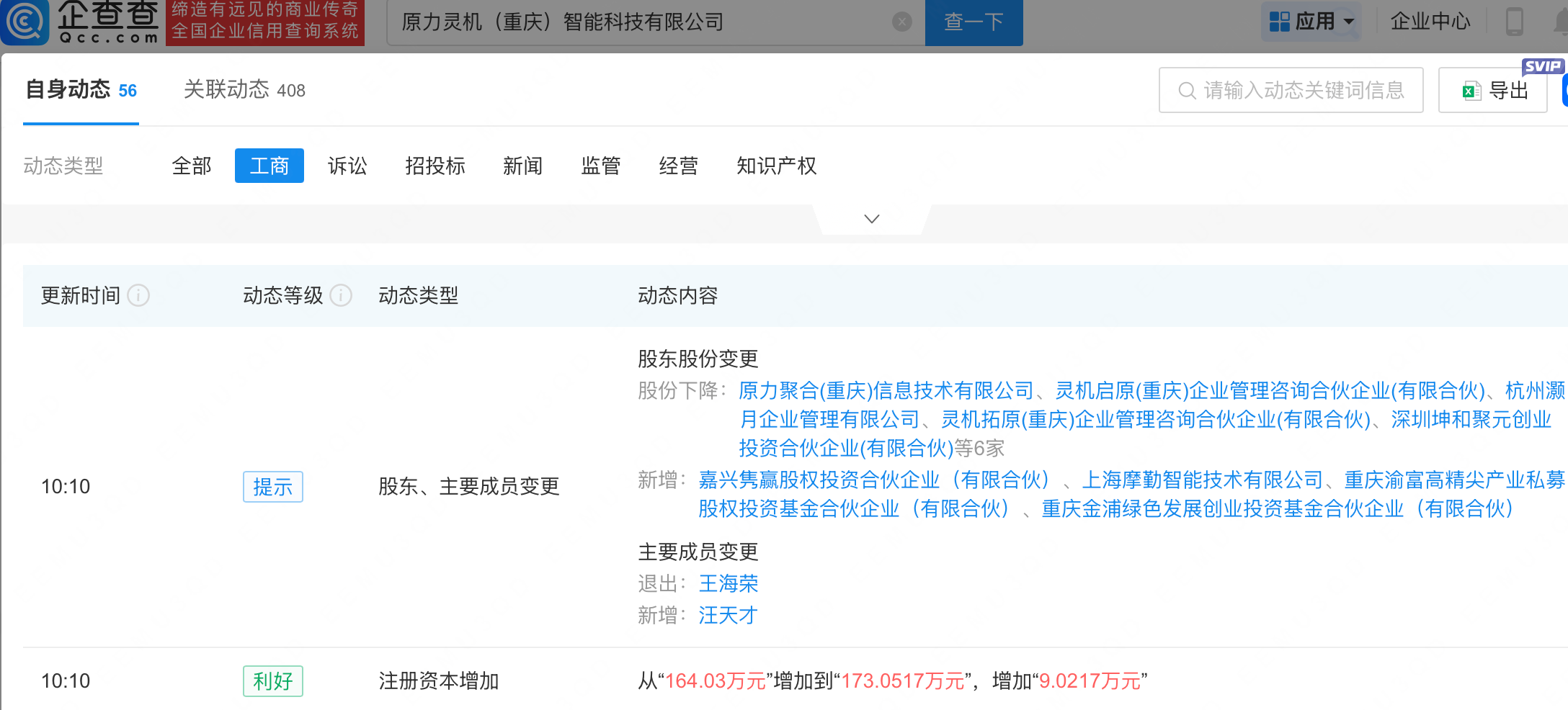 企查查APP显示,近日,原力灵机(重庆)智能科技有限公司发生工商变更,新增华勤技术(603296)全资子公司上海摩勤智能技术有限公司等为股东,同时注册资本增至173.05万元。企查查信息显示,该公司成立于2025年3月,经营范围包含:人工智能基础软件开发,人工智能应用软件开发,智能机器人的研发,智能机器人销售等。公开信息显示,原力灵机是一家具身智能科技公司。