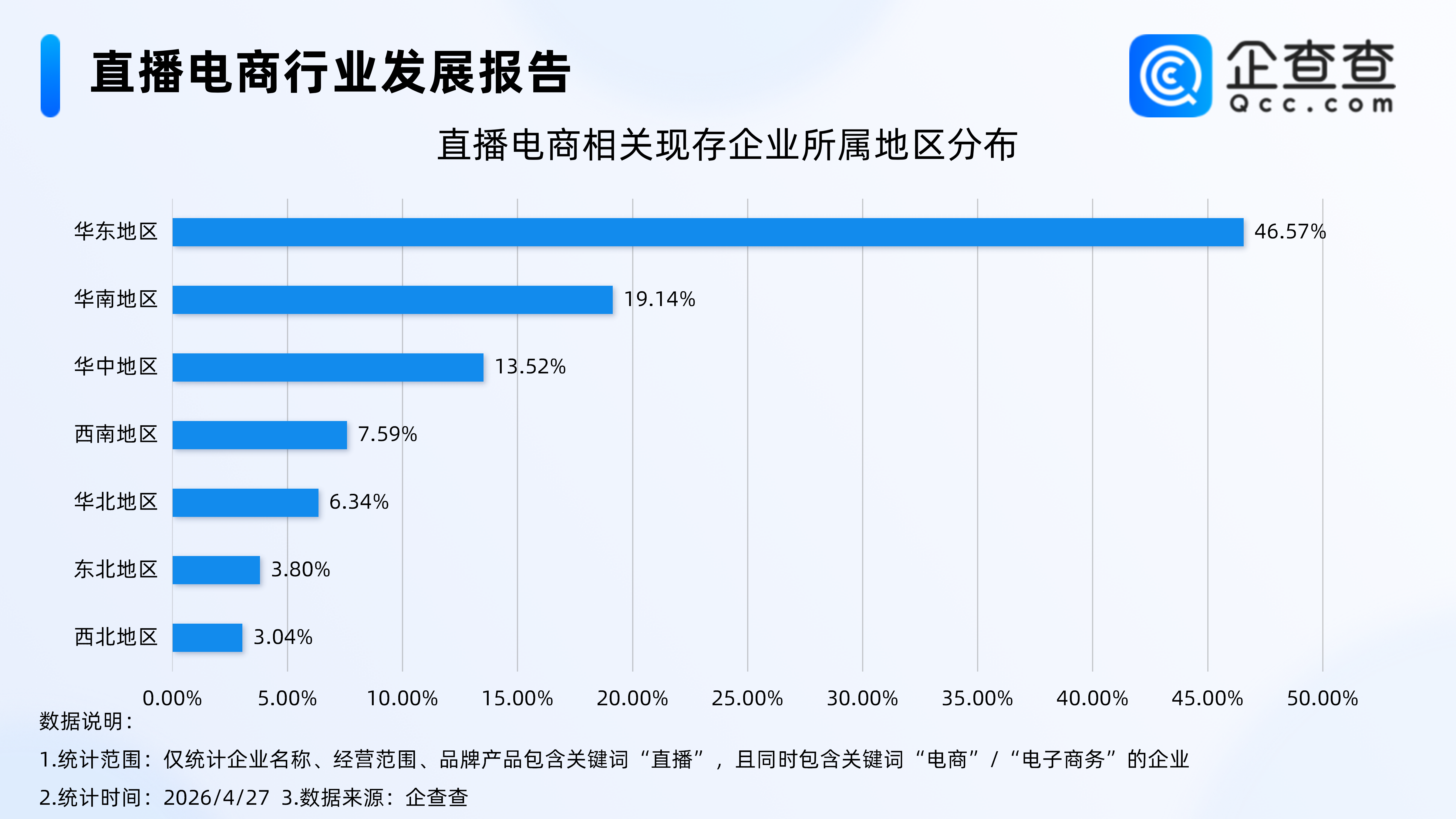 企查查数据显示,截至2026年4月27日,国内现存直播电商相关企业23.06万家,主要分布在华东地区、华南地区,分别占比46.57%、19.14%。华中地区占比13.52%,西南地区、华北地区合计占比约14%。相比之下,东北地区、西北地区占比最低,分别为3.80%、3.04%。华东地区凭借电商产业链成熟、仓储物流发达以及大量优质货源的集聚优势,成为直播电商企业密度最高的区域。