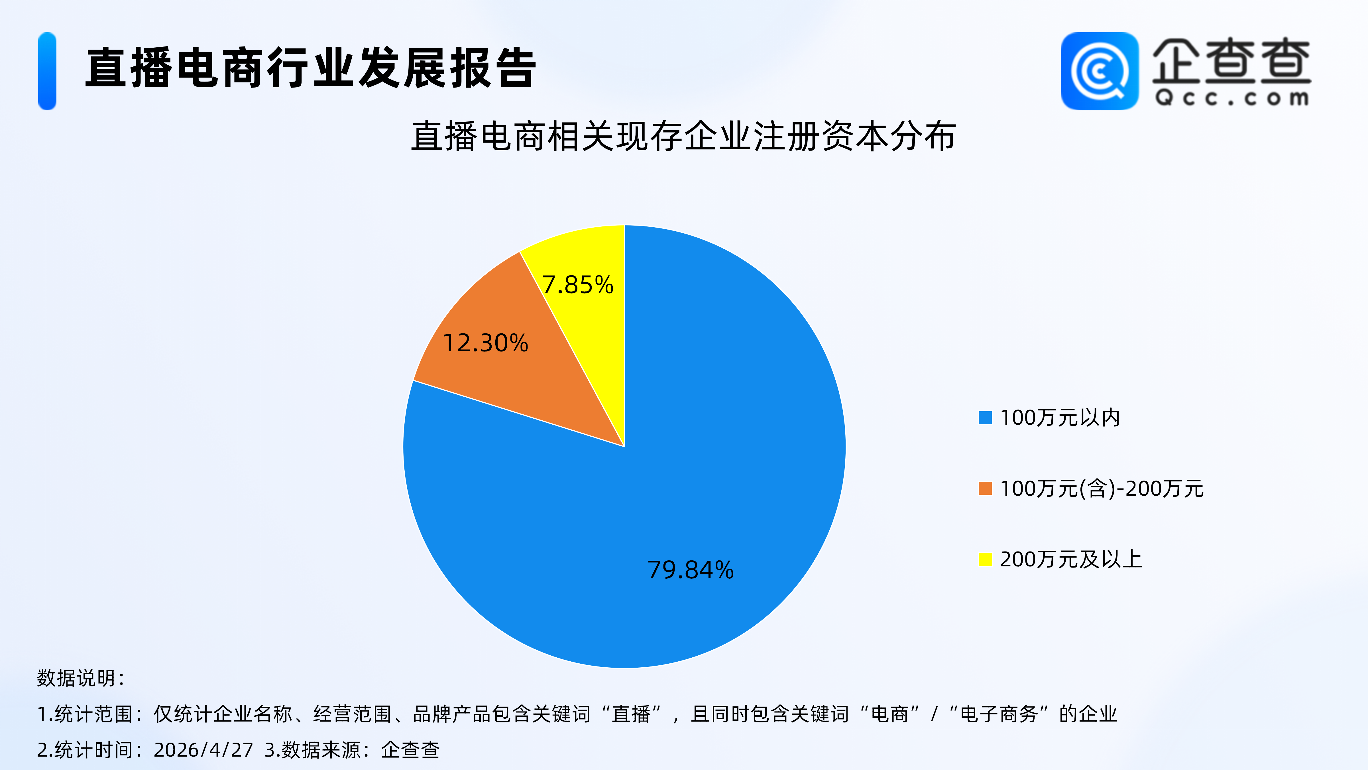 企查查数据显示,注册资本分布上,直播电商相关企业普遍呈现轻资产特征,注册资本在100万元以内的相关企业占比最高,达79.84%;注册资本在100万元(含)-200万元之间的企业占比12.30%。200万元及以上的相关企业占比不足10%,达7.85%。