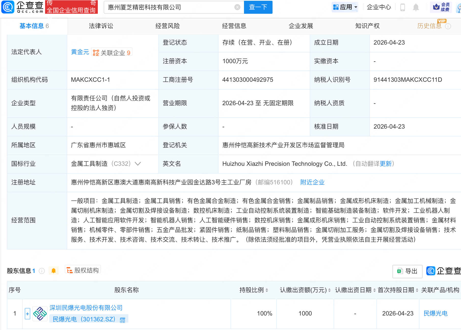 企查查APP显示,近日,惠州厦芝精密科技有限公司成立,经营范围包含:人工智能应用软件开发;智能机器人销售;人工智能硬件销售;数控机床销售等。企查查股权穿透显示,该公司由民爆光电(301362)全资持股。